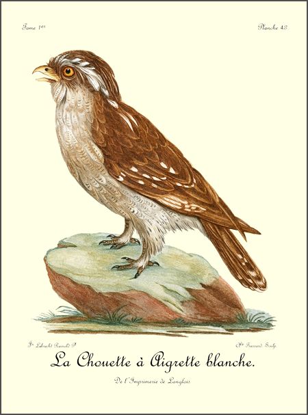 Le Blagre est de la taille de notre balbusard; ses plumes ont la rudesse de celles des martins-pêcheurs, sur-tout celles du 24 ventre, dont les barbes sont très-serrées et fort unies entre elles. La tête, le cou, et tout le plumage antérieur, sont d’un blanc satiné. Sur la tête et le derrière du cou, la côte de chaque plume est brunâtre; le manteau et les petites couvertures des aîles sont d’un léger gris-brun, ainsi que la queue, dont le bout est blanc. Les grandes pennes sont noirâtres; les moyennes ont leurs barbes extérieures de la même couleur que le manteau; le bec est brunâtre, les pieds sont jaunes, les ongles noirs et l’iris est d’un brun foncé.