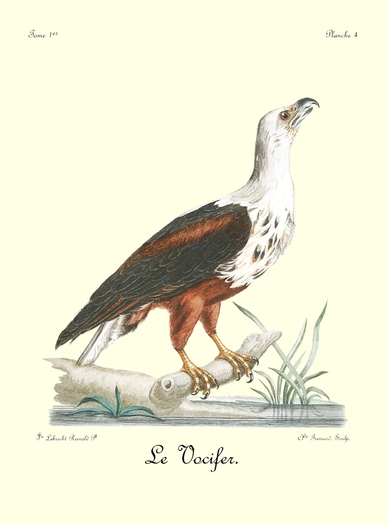 Voici, sans contredit, une des plus belles espèces d’aigles; non-seulement distinguée par la beauté de son plumage, mais encore par l’élégance de sa forme et par sa taille, dont les dimensions égalent celles de l’orfraie. Le Vocifer est remarquable par le blanc de la partie antérieure du corps et de la queue, et par le brun-roux mêlé de noir qui en pare le reste; les plumes de la tête, du cou et des scapulaires, qui sont également blanches, montrent toutes leurs côtes brunes. Celles de la poitrine portent quelques taches rares, longitudinales, d’un noir-brun; le reste du plumage est d’un brun ferrugineux, flambé d’un noir brûlé; les plus petites couvertures des aîles sont d’une teinte plus claire, approchant de la rouille; les scapulaires qui les avoisinent sont mêlés de noir, et tranchent agréablement sous le blanc des autres, qui s’étendent sur le dos en pointe de mouchoir. Les pennes de l’aîle sont noires, et en partie comme finement marbrées de blanc et de roux à leurs barbes extérieures; le bas du dos et les recouvremens du dessus de la queue sont d’un noir mêlé de blanc sale. Entre le bec et l’œil, la peau se montre, et cette partie est seulement couverte de poils rares: sa couleur est jaunâtre, ainsi que la base du bec, les pieds et les doigts. L’iris est d’un brun-rouge; les plumes des jambes descendent d’un demi pouce sur le tarse par devant; les ongles et le bec sont d’un bleu de corne; le jabot, qu’on apperçoit un peu, est couvert d’un duvet long et frisé. La queue est légèrement 18 arrondie; c’est-à-dire, que les pennes extérieures sont les plus courtes, tandis que les autres s’allongent successivement jusqu’aux deux du milieu qui sont les plus longues et d’ailleurs égales entre elles.