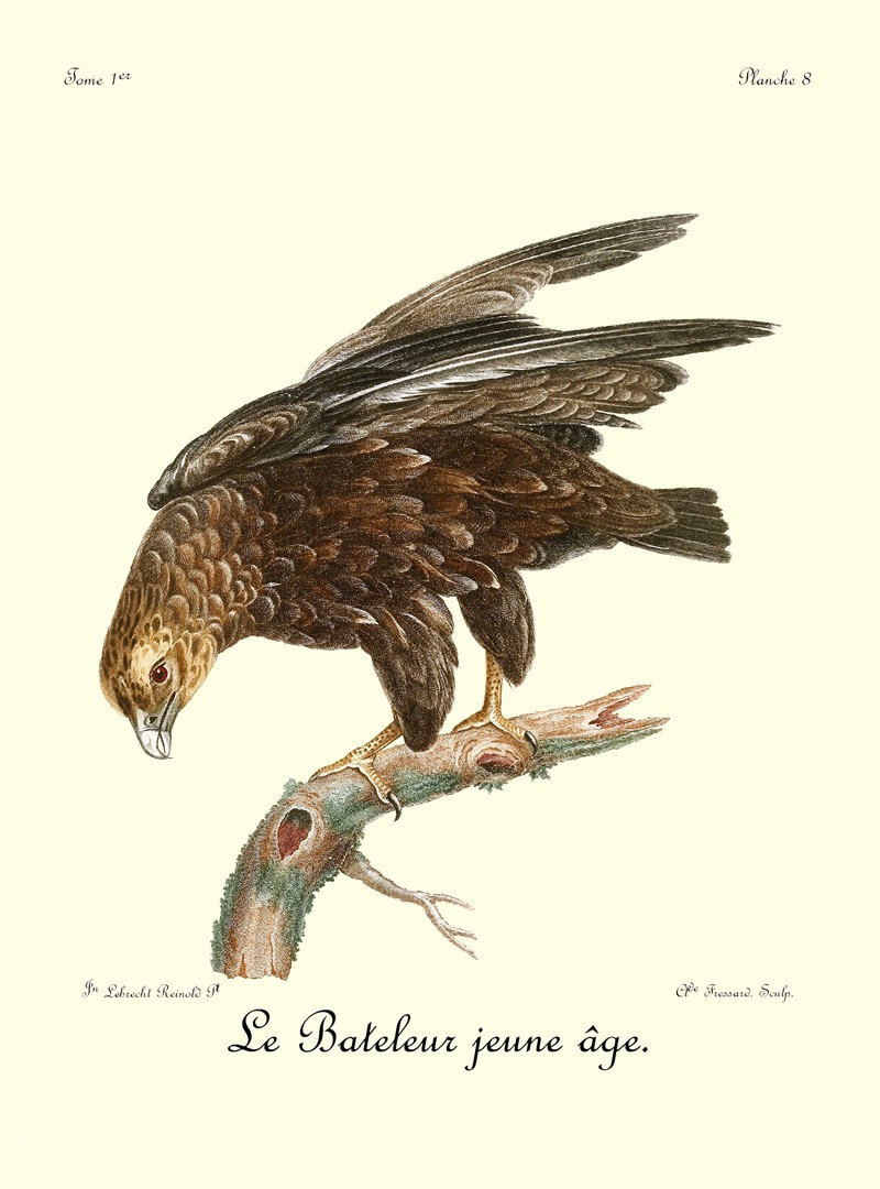 Le Bateleur bâtit son nid sur les arbres; la femelle pond trois ou quatre œufs, qui sont entièrement blancs: c’est du moins ce que m’ont assuré les colons des cantons qu’habitent ces oiseaux; car je n’en ai jamais vu la ponte. Quant aux jeunes, j’en ai tué plusieurs: dans cet état, ils sont si différens des vieux par leurs couleurs, que, si je ne les avois pas tués pendant que le père et la mère leur donnoient encore à manger, quoiqu’ils fussent aussi forts qu’eux, et si, en les disséquant, je ne les avois reconnu pour être de jeunes oiseaux, il est certain que je les aurais pris pour une seconde espèce du même genre. Lorsque je les apperçus, ils étoient au nombre de six, tous perchés sur un très-gros arbre, qui portoit l’aire où probablement les quatre petits étoient éclos. J’abattis d’abord le père et la mère, après quoi je parvins à tuer trois des jeunes, et ne pus joindre le quatrième, qui s’étoit envolé trop loin dans le bois. Parmi ces trois jeunes, je reconnus, à la dissection, un mâle et deux femelles; et il est plus que probable que celui qui m’échappa étoit un second mâle. Les trois jeunes Bateleurs portoient exactement la même livrée, telle qu’on peut la voir dans la planche 8, où j’ai fait représenter l’une des jeunes femelles. J’ai tué, quelques mois après, d’autres jeunes oiseaux de la même espèce, mais plus avancés en âge: ils portoient déja beaucoup de plumes rousses sur le croupion; sur toute la tête et le dessous du corps poussoient aussi plusieurs plumes noires. Il paroît donc que ce n’est qu’à la troisième mue que le Bateleur prend entièrement sa belle livrée, telle qu’on la voit dans notre planche enluminée, No. 7.