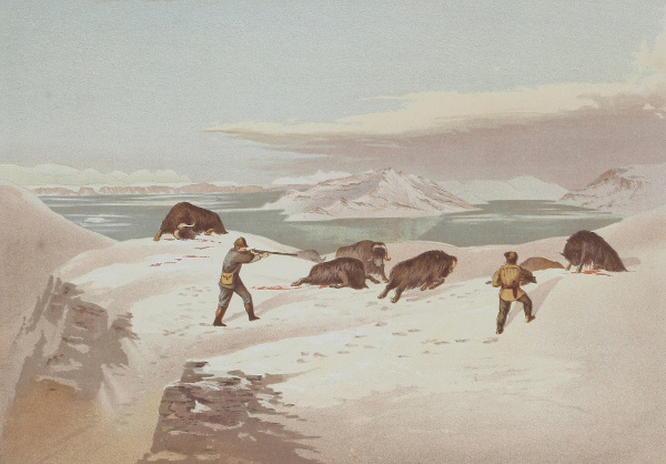 A small ravine intersects the cliff-edge a little eastward from the “Aukrey,” and on the brow over it we came upon two structures, evidently the work of man, puzzling enough at the time, but which we have since learnt to recognise as Eskimo meat caches or safes. Each consisted of a pile of stones covering in a long rectangular chamber, left open at one end, but easily closed by a flat stone which lay close by. Both stood in a conspicuous position on the top of a little rise, and were surrounded by lemming and fox marks. A mile further eastward, the cliffs promised a good commanding position for a view, but the rough and undulating hill-tops took us a good while to get over. At length the ascent of the last ridge was commenced, when suddenly a snow-white object appeared over the brow. It was an Arctic hare, the first we had seen. He was evidently astonished at the reappearance of his old enemy, man, and it was not till after he had made a careful examination of us, standing straight up, full length, on his hind feet, that he concluded we were to be avoided. Then off he went, running ten or fifteen paces erect, then a bound or two on all-fours, then erect again, and finally, when he had run some eighty or one hundred yards, he stopped for another look, sitting on his haunches like a dog begging. This time we were ready for him; he presented a steady mark, and his curiosity was fatal to him. On going to pick him up, we came on a low wall of stones roughly piled, nowhere more than two feet high, leading from the cliff-edge on the right, for about eighty yards inland, to a small shallow tarn; it was apparently some Eskimo hunting contrivance, possibly to assist in driving small game to a suitable spot over the cliffs. Amongst the rounded boulders in the margins of the tarn lay a great number of shed antlers of reindeer, some of them broken and moss-grown, half-buried in the mud; others bleached white, but evidently of no great age. The tips of almost all showed marks of having been gnawed by foxes. Some scattered antlers were found on other parts of the hills, but were always numerous round the tarns; every one we met with had horns of various sizes and ages lying about it.