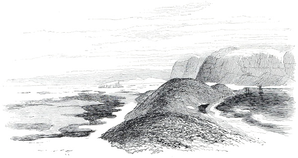 Yet though there was no trace of man or his doings, Nature had left deeply significant records of her own to tell the history of the land. The neighbourhood of the ship was rich in such evidences. No one could walk over the broad “mud flats” half-a-mile inland from the ship without being convinced that the land had risen from the sea at, geologically speaking, no very distant period. Shells similar to those still living in the sea two hundred feet below lay strewn in abundance on the fine sand. Here a pair of valves, enormously thickened to bear the crush of ice, there a whole bed of slighter shells, still covered with their brown filmy skins, and connected by their gristly hinges. The mud itself was so salty, that where it dried in the sun a white briny coat formed on its surface. Stems and roots of laver sea-weeds were sometimes picked up, [72] but the most interesting and eloquent witnesses of the past were the splinters and logs of drift-wood that lay imbedded in the mud, or scattered along the crests of these raised beaches. The wood was easily recognised by the microscope as the wood of pine trees, and though probably very many centuries old, was often so apparently fresh as to smell woody when cut. It was not for us to conjecture when or where that wood had grown, or how it had drifted to its present elevated site; but we could not help thinking that it told of a time when the shores, though perhaps far more deeply laden with glaciers, were washed by a less ice-bound sea.