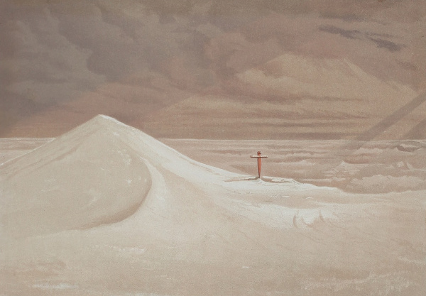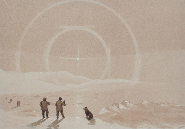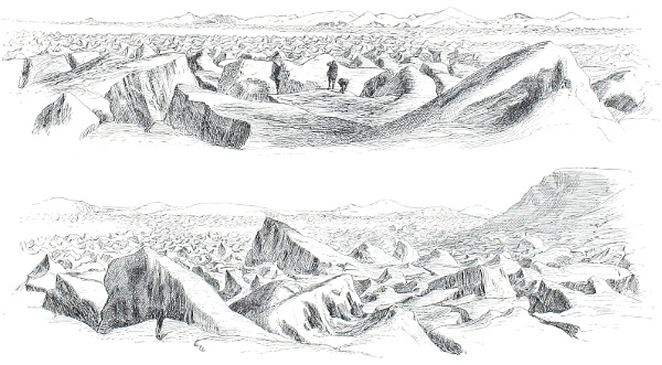 On reaching the summit we were amply rewarded for our expenditure of energy. The prospect was truly magnificent. A thousand feet below, the blue waters of Foulke Fiord lay, rippled with a breeze, under the richly-coloured cliffs of the opposite shore; further on, the flat expanse at the head of the inlet, with Alida Lake, and Brother John’s Glacier of Kane, shaped like a great paw, closed in the valley. Beyond and above all, a broad white plain, the vast inland ice of Greenland, lay spread before us. Even at first sight, this sea of ice could not be mistaken for a frozen sea, for its distant horizon was sensibly above our level.
