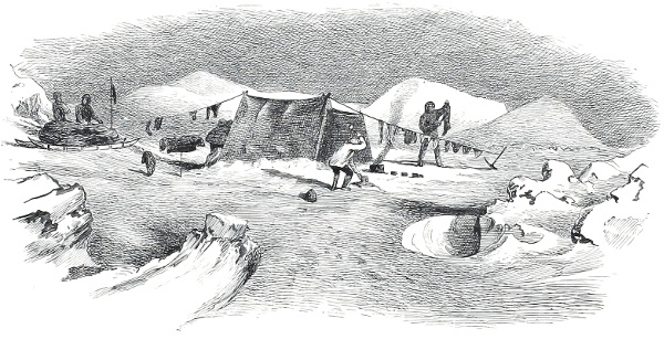 On the night of the 12th and morning of the 13th the attempt was made, but the full steam power of the ship was utterly helpless against the ponderous ice. It was simply impossible to bore even one half-mile into a pack of such proportions, and we were obliged to turn back and wait for a chance opening. Some hours before we made this attempt, a messenger had come down the hill with a report that the two tents had been made out with the telescope [77] still pitched on the shore of Thank God Harbour, Polaris Bay. The signalman even thought he could distinguish figures passing to and fro between them, but the wish was father to the thought: we afterwards learnt that neither tents nor men were there; the party had really left that shore five days earlier, and embarked on the most extraordinary journey of this, or indeed of any other expedition.