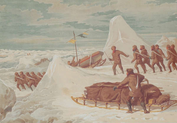 It was eight in the evening when they once more moved forward on this final effort, and for nine hours they made fair progress, but then a change came, a strong wind sprang up against them and hurried the pack still faster away from shore. Presently the floes, forced by both wind and tide, began to move with alarming violence, wheeling and turning in a most perplexing way, so that the men over and over again crossed their own track. They were now [78] sixteen hours on the march, and every hour the land looked more distant, but they still fought on, with every thought concentrated on hurrying on at full speed. If they had stopped to consider it, there was not at this time the faintest human possibility of reaching the land against the ice-drift. But their misfortunes had reached a climax; at one in the afternoon of the 11th the wind veered to the opposite direction, and came on to blow hard. The wheeling and tossing of the floes greatly increased, but the fatal drift was checked. Providence had given them this chance, and they one and all determined to make the most of it, so, redoubling every effort, they pushed on for the land. Some fell asleep as they pulled in the drag-belts, and when they reached the edge of the pack and launched their boat, others slept at the oars. But finally, at seven in the morning of the 12th of August, land was reached, and they flung themselves down on the beach at Cape Lieber after an unprecedented march of thirty-two consecutive hours. When they had rested at this point, they had but to cross Lady Franklin Strait to reach the ships. The distance was about twelve miles, and the floes comparatively stationary. One march brought them more than half-way over, and just as they began the second, shouts and cheers coming to them across the ice heralded the arrival of a strong party from the “Alert.” They had been seen by our look-outs, and were all soon on board, and never were guests more welcome. Next day, 15th August, they reached their own ship, after an absence of no less than 130 days.