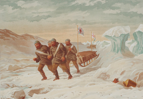 Leaving their ship on the 6th of April, 1876, and re-provisioning their sledges from the “Alert” on the 20th, her parties had crossed over Robeson Channel to the south-eastward, and reached the Greenland coast at a point twelve miles north of the spot where Hall’s cairn and record marked the most northern position attained by the sledges of the American Expedition. The “Discovery’s” crews may therefore be said to have begun their sledging where their gallant predecessors left off. The shore led to the north-east, and was piled with ice. Their path lay along banks of drifted snow, so steep that it was necessary to dig a groove for the landward runner of the sledge, to prevent it slipping down into the trenches and moats cut by the wind round the piles of sea-ice. These trenches were sometimes forty feet deep. When they were thirty-four days out from their ship, they arrived at the end of the continuous land, and here their last supporting sledge turned back, and left Lieutenant Beaumont’s sledge, the “Sir Edward Parry,” to proceed alone. Islands with steep cliffs lay before them, separated by broad fiords. Looked at from the cliffs above them, the fiords promised good travelling, for inside the line of heavy polar floes their surface was one level sheet of snow. But, unfortunately, the treacherous snow was soft. Sledge and men sank deep at every step. Pulling out each foot was like pulling off a boot, and sometimes the men preferred to creep on hands and knees rather than attempt to walk. Their ankles swelled and knees became stiff. Not a vestige of game of any sort cheered their journey. On their forty-fifth day out they had crossed the third and broadest of the fiords, and their waning stock of provisions warned them to return. For many days fog and constant snow closed in their prospect, but from a mountain nearly four thousand feet high they got a view of Cape Britannia and the islands about it far to the north-east, nearly in north latitude 83°.