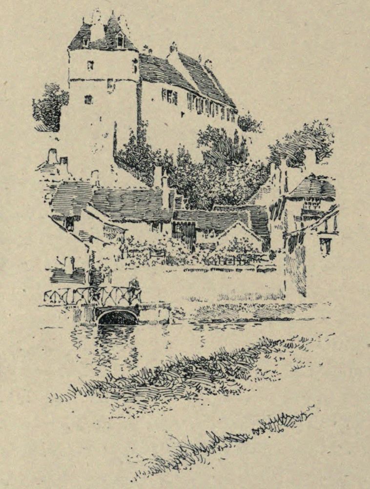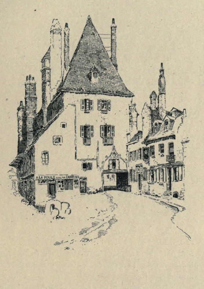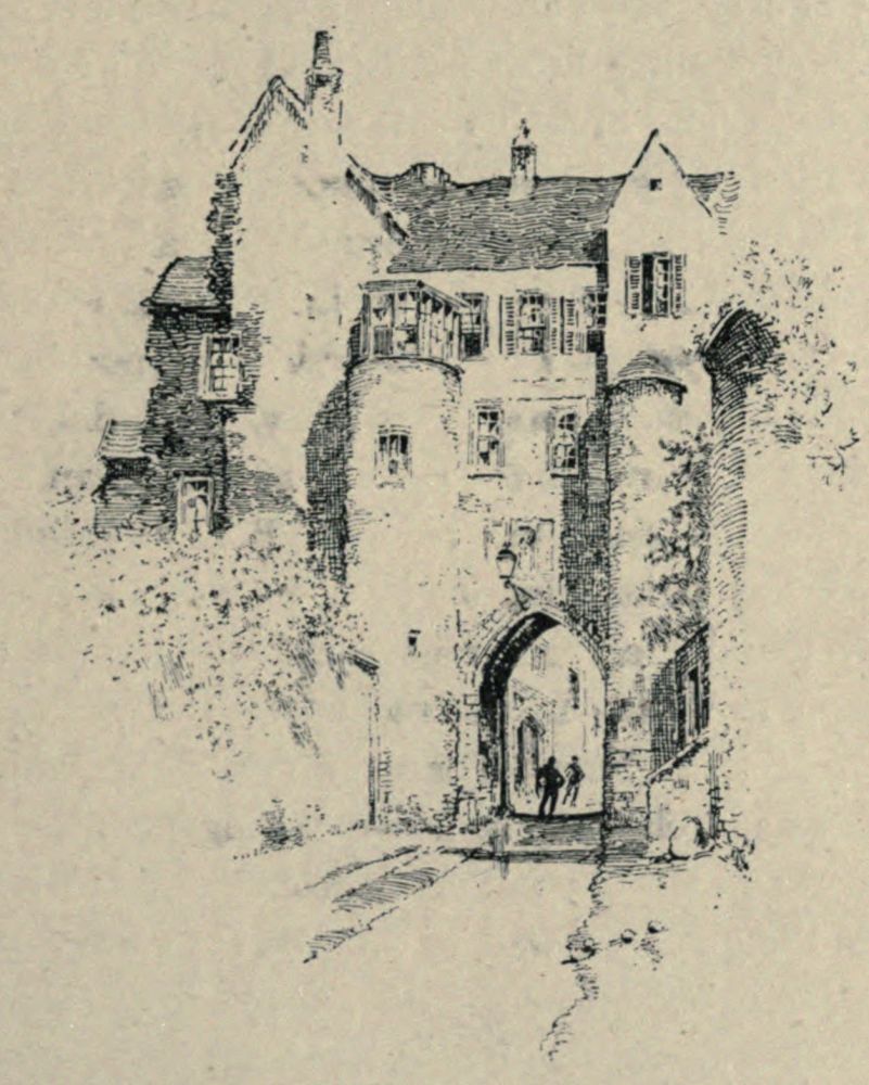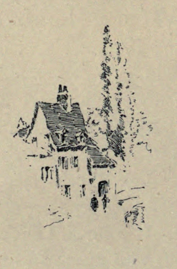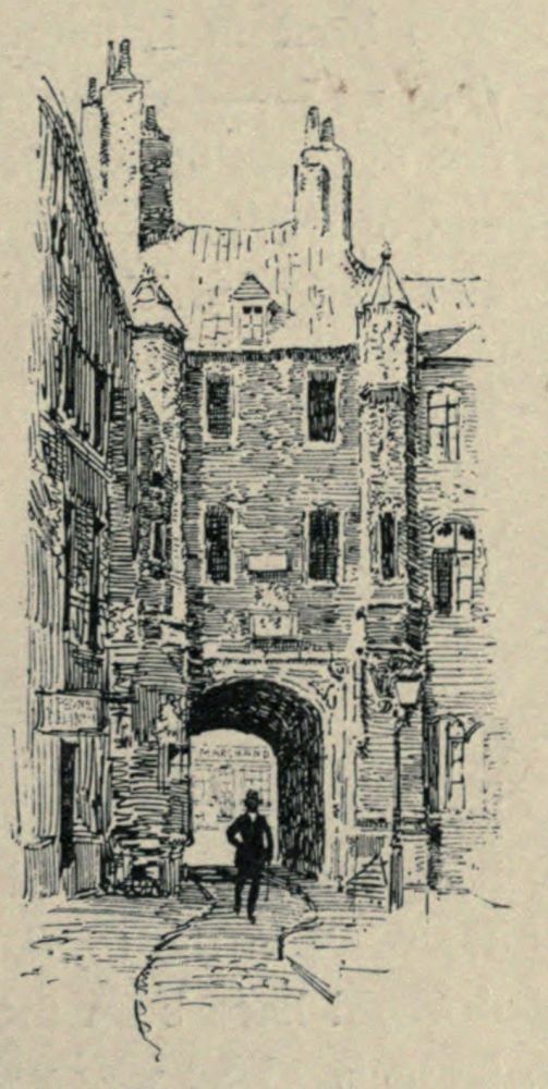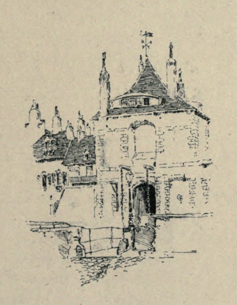 As every one who has passed in the Paris train knows, at the entrance of the town is the town-gate, a heavy grey pile, with high-gabled roof and drawbridge, the chains of which hang on either side the archway. Now that Dessein’s was gone, J—— declared that it interested him more than anything else in Calais, since Hogarth had painted it; and he began an elaborate study. It was not easy work. To the people in their holiday humour the combination of knee-breeches and sketch-book was irresistibly comic. But he went bravely on. I have rarely seen him more conscientious over a sketch. Indeed he was so pleased with this gate that later, when, at the end of a street, we came to another, under a tall[26] turreted house, and leading into a large courtyard, nothing would do but he must have that as well.—In a word, he was in a mood to draw as many gates as he could find; but by this time at the Hôtel Meurice dinner was on the table.