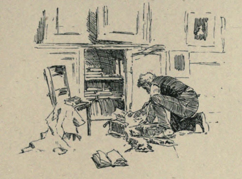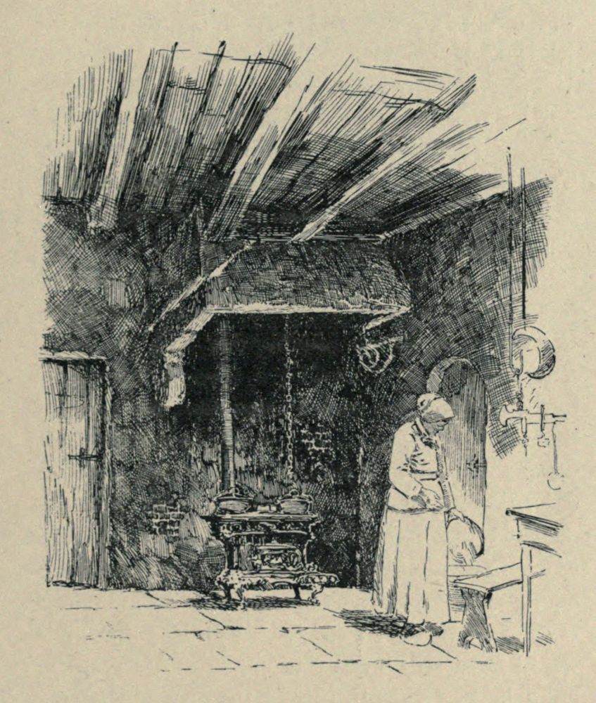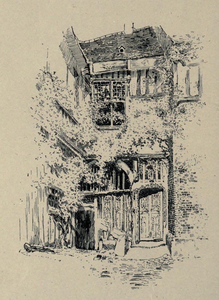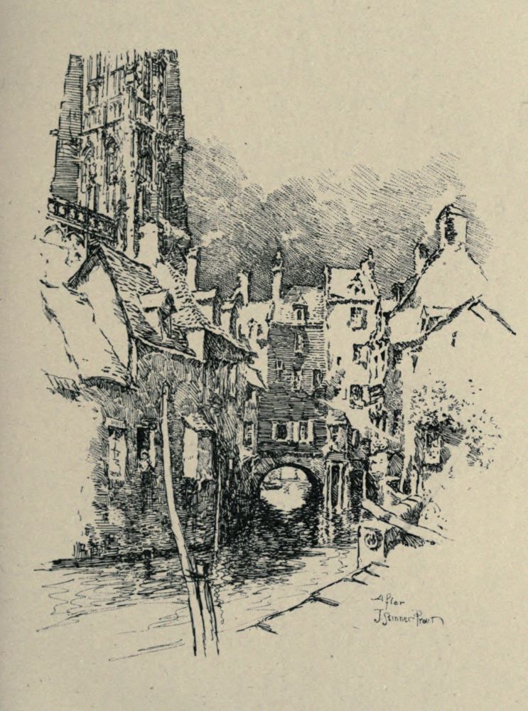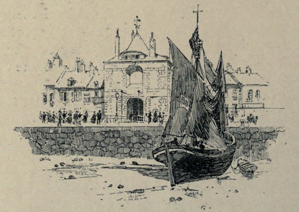As every one who has passed in the Paris train knows, at the entrance of the town is the town-gate, a heavy grey pile, with high-gabled roof and drawbridge, the chains of which hang on either side the archway. Now that Dessein’s was gone, J—— declared that it interested him more than anything else in Calais, since Hogarth had painted it; and he began an elaborate study. It was not easy work. To the people in their holiday humour the combination of knee-breeches and sketch-book was irresistibly comic. But he went bravely on. I have rarely seen him more conscientious over a sketch. Indeed he was so pleased with this gate that later, when, at the end of a street, we came to another, under a tall[26] turreted house, and leading into a large courtyard, nothing would do but he must have that as well.—In a word, he was in a mood to draw as many gates as he could find; but by this time at the Hôtel Meurice dinner was on the table.