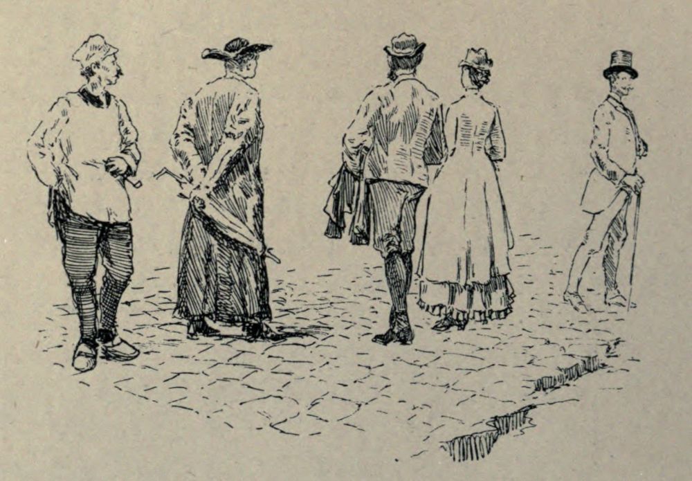 being but modest folk, we keenly felt the glances and smiles of the well-dressed men and women on the Rue Royale. To find a quiet place we walked from one end of the town to the other; through the Square where Mr. Shandy would have put up his fountain, and where a man at an upper window yelled in derision, and a woman in a doorway below answered——