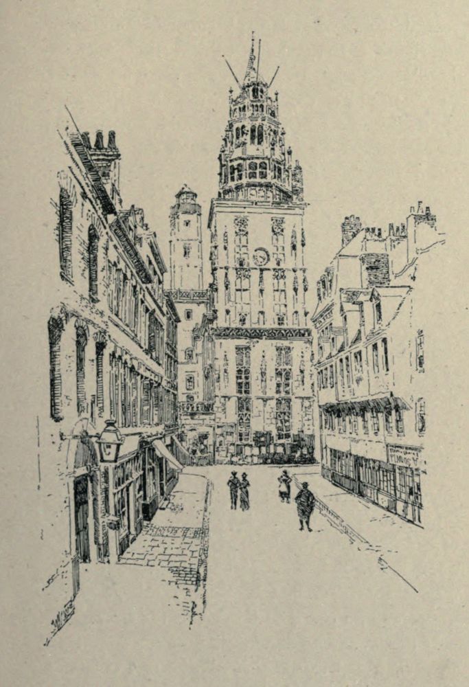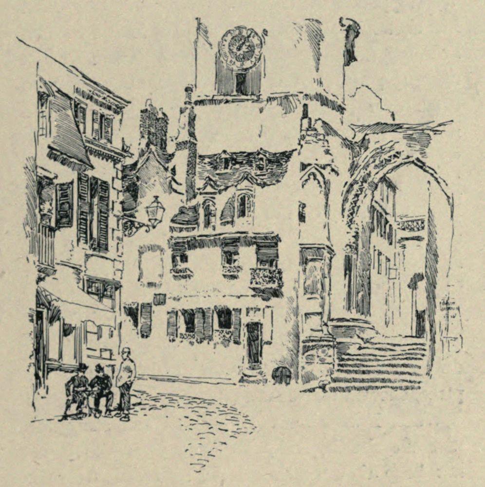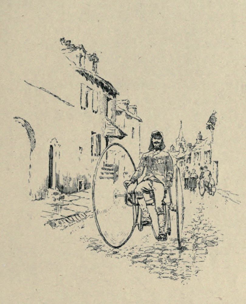THE milkman, followed by his goats, was piping through the town, and the clock over the geraniums in the court was just striking eight, as we disposed of our bill—not without numerous complaints, in which every one but some English tourists joined—and wheeled the tricycle out to the street.—Though the old motherly[29] femme-de-chambre had come to see us ride, and stopped a friend to share this pleasure, and though there were many faces at the dining-room windows, the sight of the pavé, or French paving, kept us from mounting. We walked, J—— pushing the tricycle, to the Place, past the grey town-hall, into the Rue Royale. We had been told that where La Fleur’s hotel once stood a museum was being built. To sentimental travellers, perhaps, this destruction of old landmarks was as worthy of tears as a dead donkey.—But it is easier to weep in a private post-chaise than in the open streets.