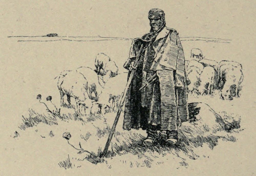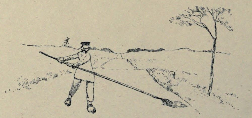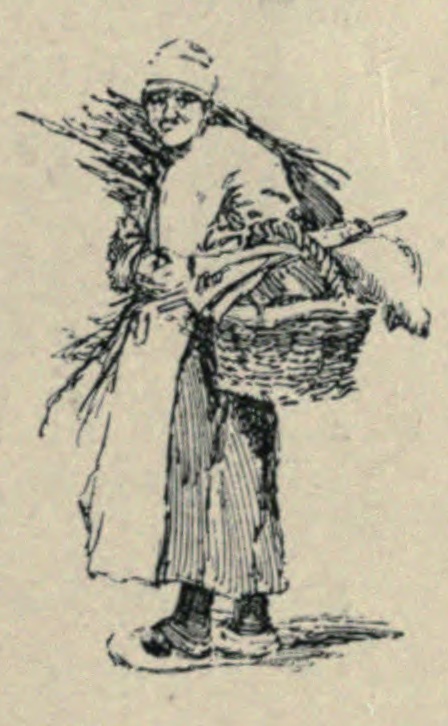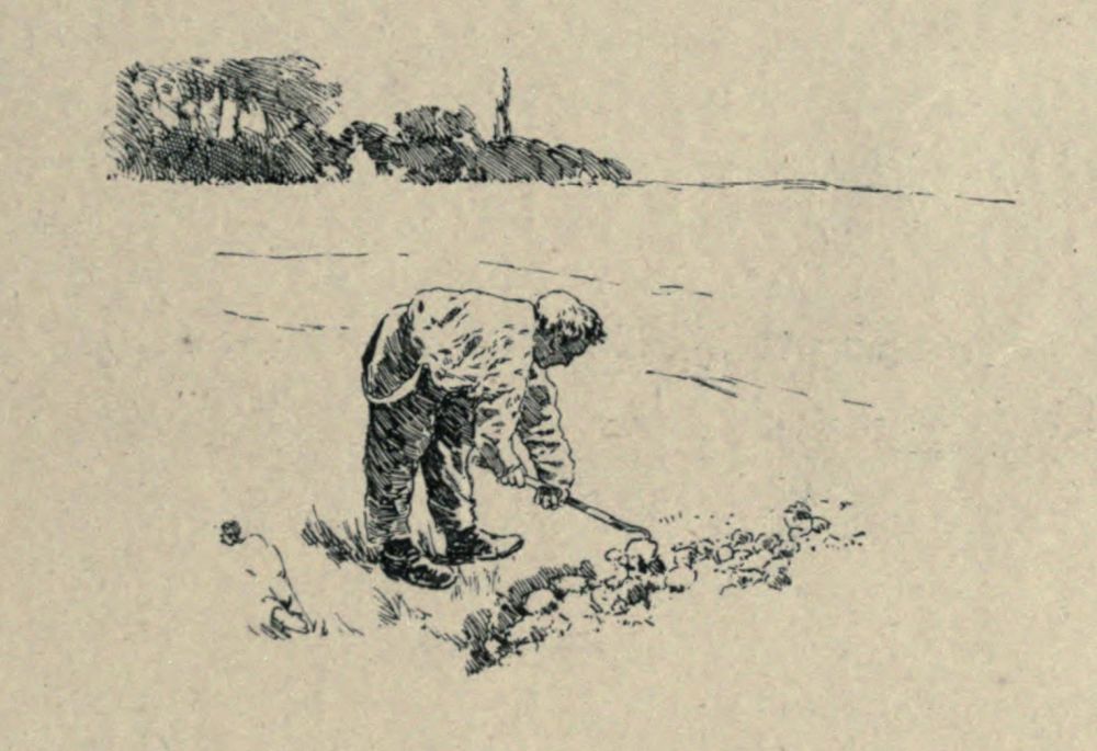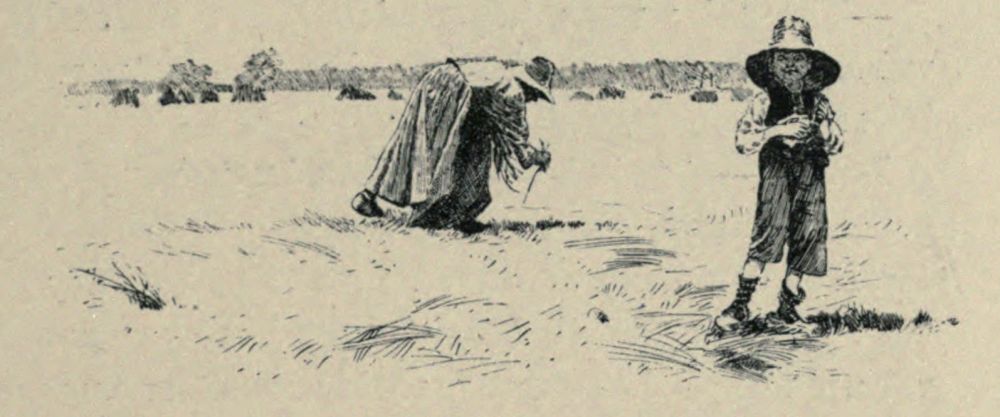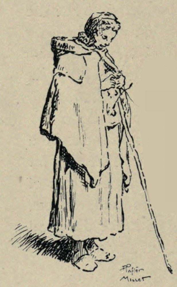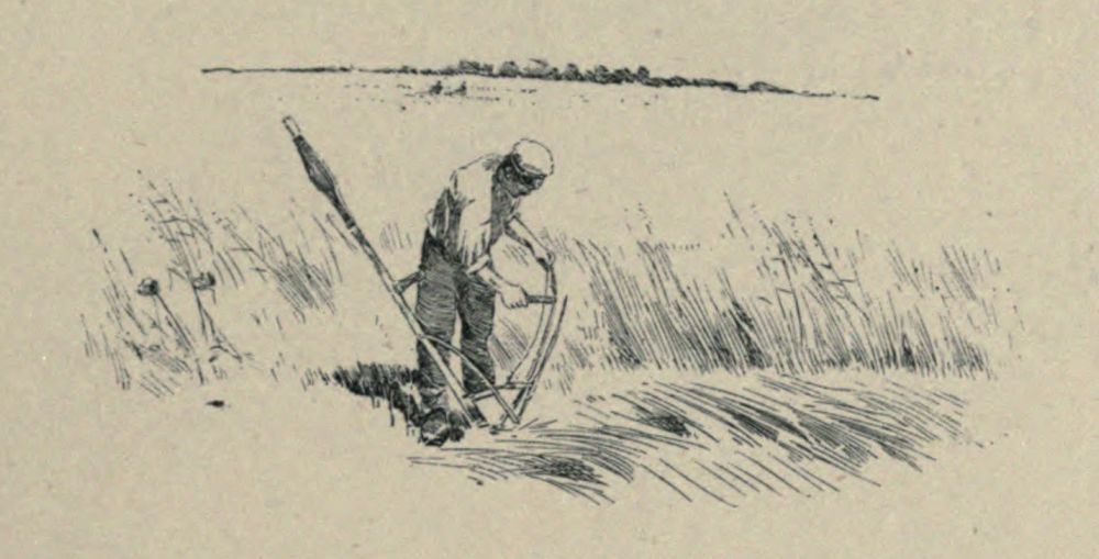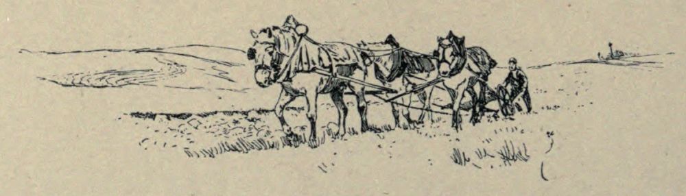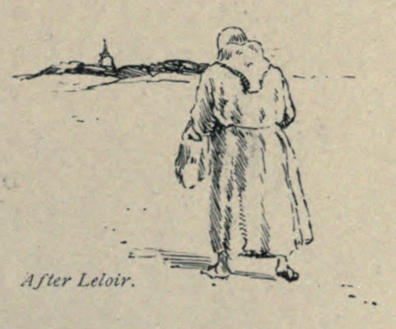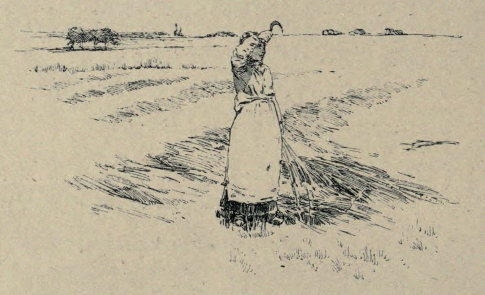 Though we thought this a rare jest at the time, we carried his advice out almost to the letter.—We had come to the terrible mountains for which we had been prepared in Calais. It is at this point, according to Mr. Ruskin, that France really begins, the level stretch we first crossed being virtually but part of Flanders. ’Tis a bad beginning, from a cycler’s ideal. For many miles I walked—and even J—— at times—along the white road, barren of the poplars one always expects in France, over the rolling treeless moors, where we were watched[32] out of sight by gleaners, their white caps and dull blue skirts and sacks in pale relief against a grey blue-streaked sky; and by ploughmen, whose horses, happier than they, ate their dinners as they worked.—Always to the north of the moorland was the grey sea-line, and farther still the white cliffs of England.