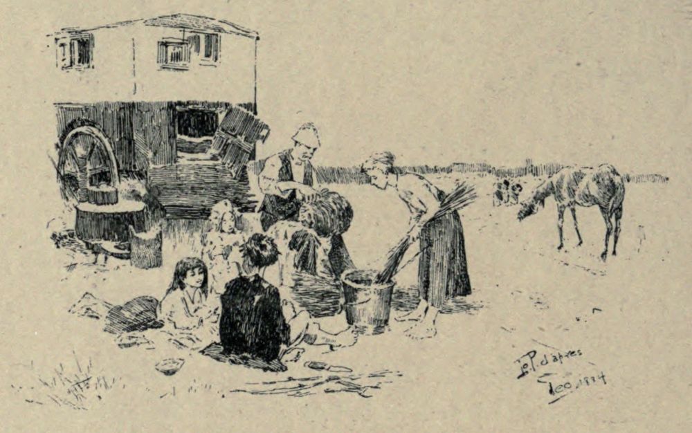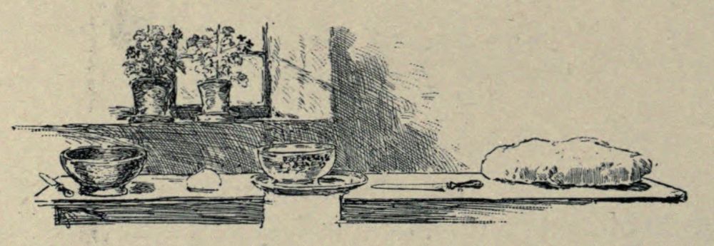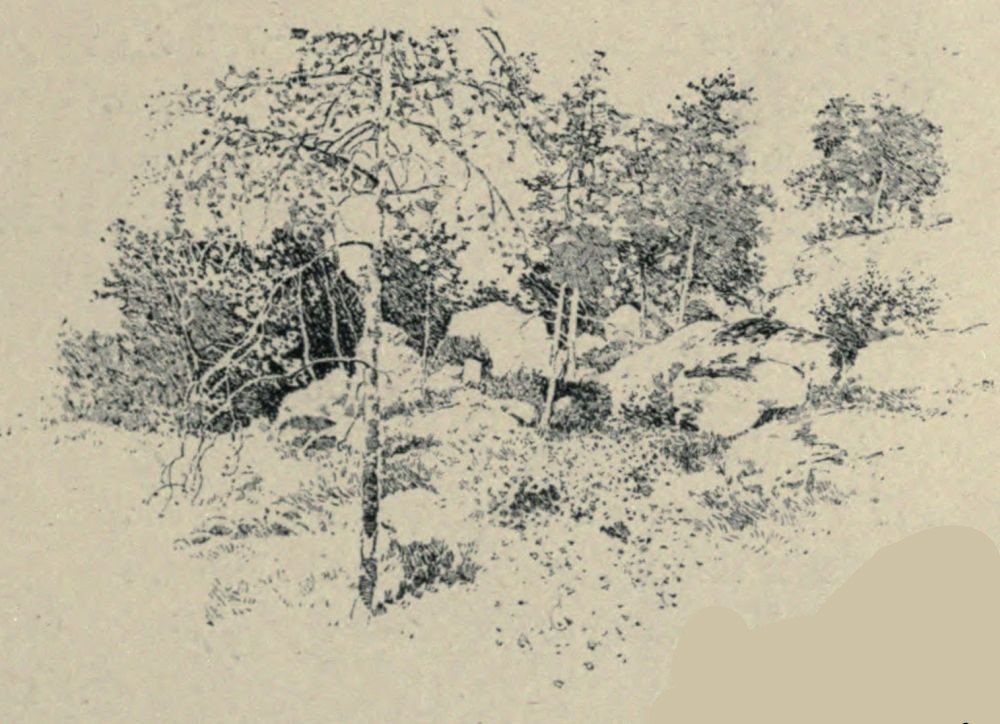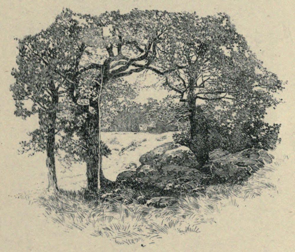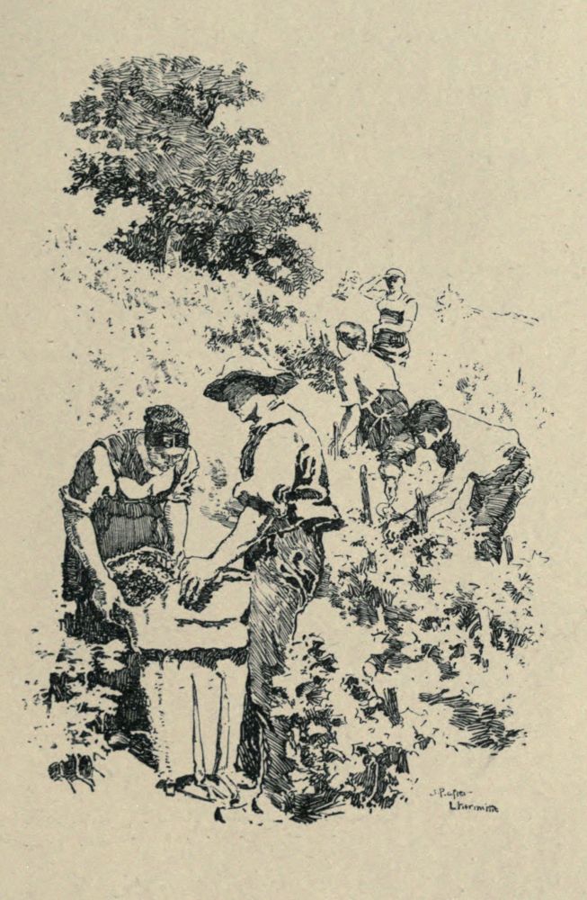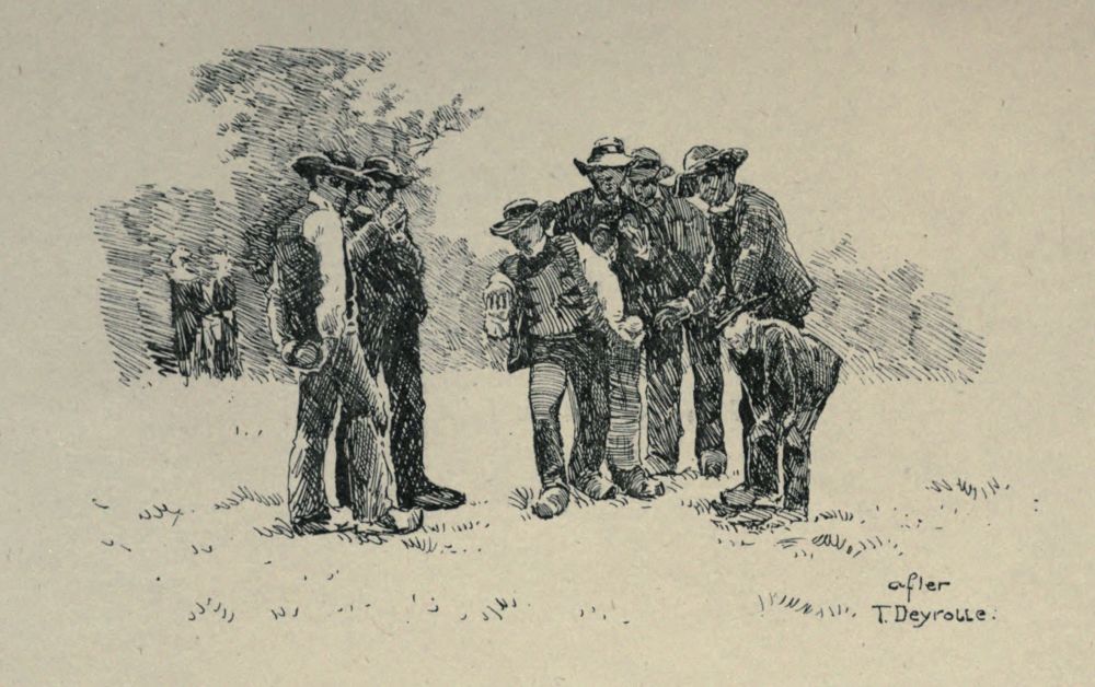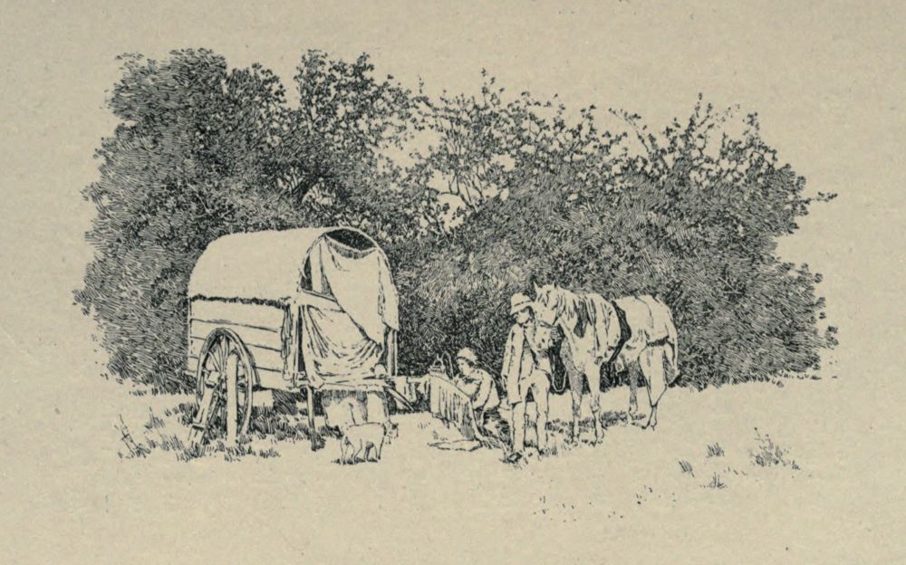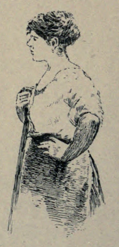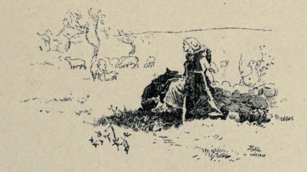 Though we thought this a rare jest at the time, we carried his advice out almost to the letter.—We had come to the terrible mountains for which we had been prepared in Calais. It is at this point, according to Mr. Ruskin, that France really begins, the level stretch we first crossed being virtually but part of Flanders. ’Tis a bad beginning, from a cycler’s ideal. For many miles I walked—and even J—— at times—along the white road, barren of the poplars one always expects in France, over the rolling treeless moors, where we were watched[32] out of sight by gleaners, their white caps and dull blue skirts and sacks in pale relief against a grey blue-streaked sky; and by ploughmen, whose horses, happier than they, ate their dinners as they worked.—Always to the north of the moorland was the grey sea-line, and farther still the white cliffs of England.