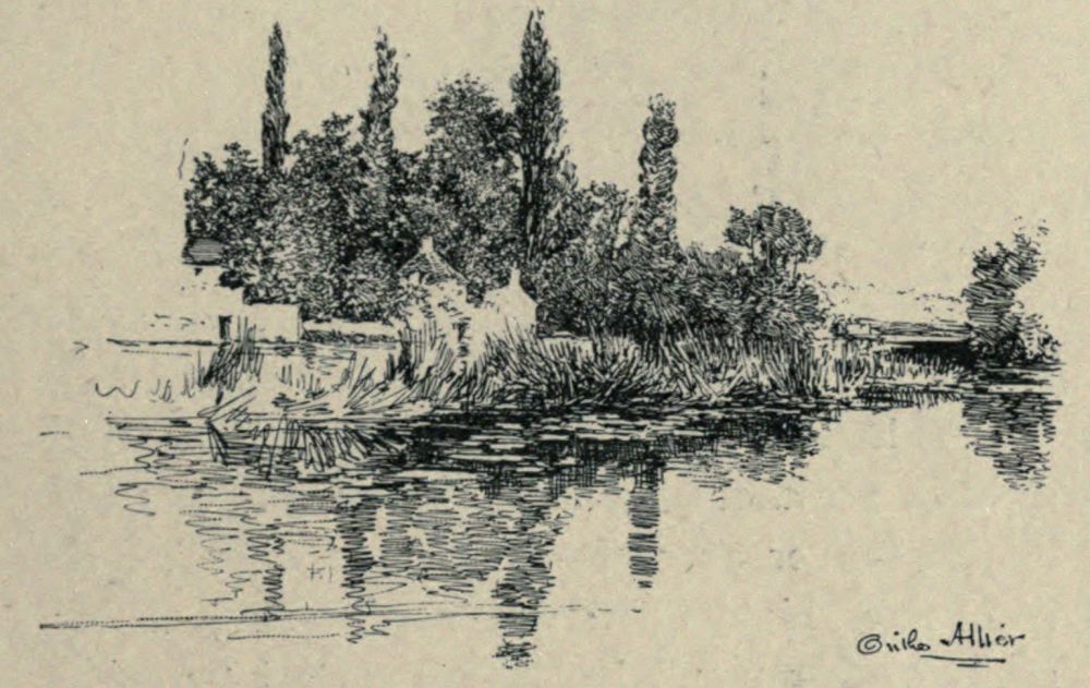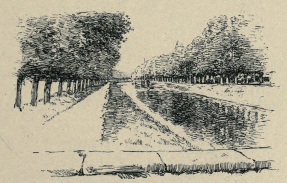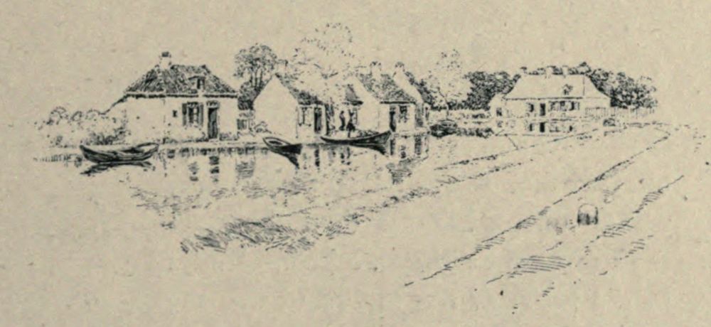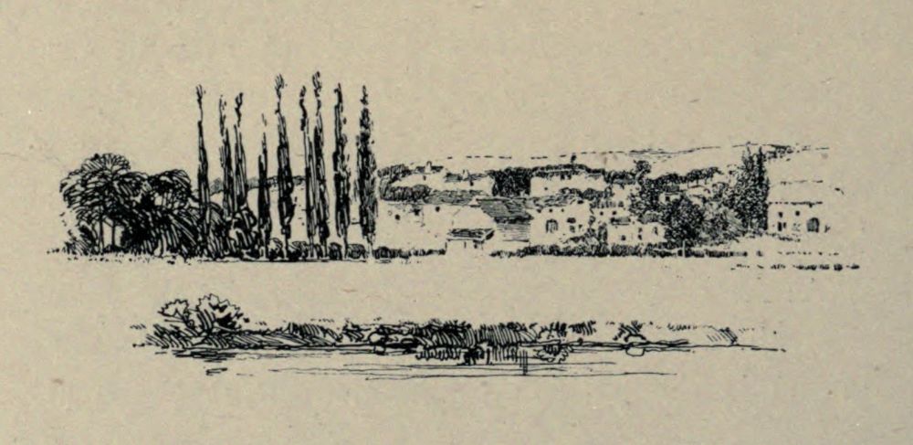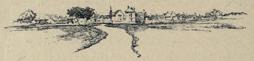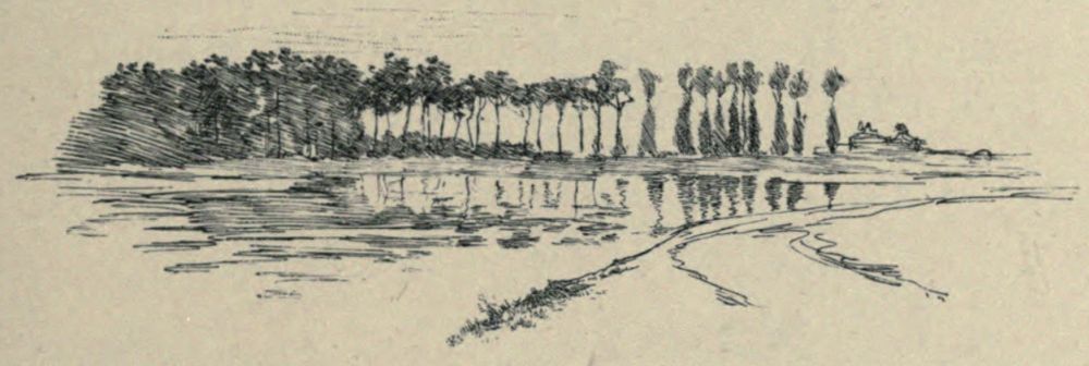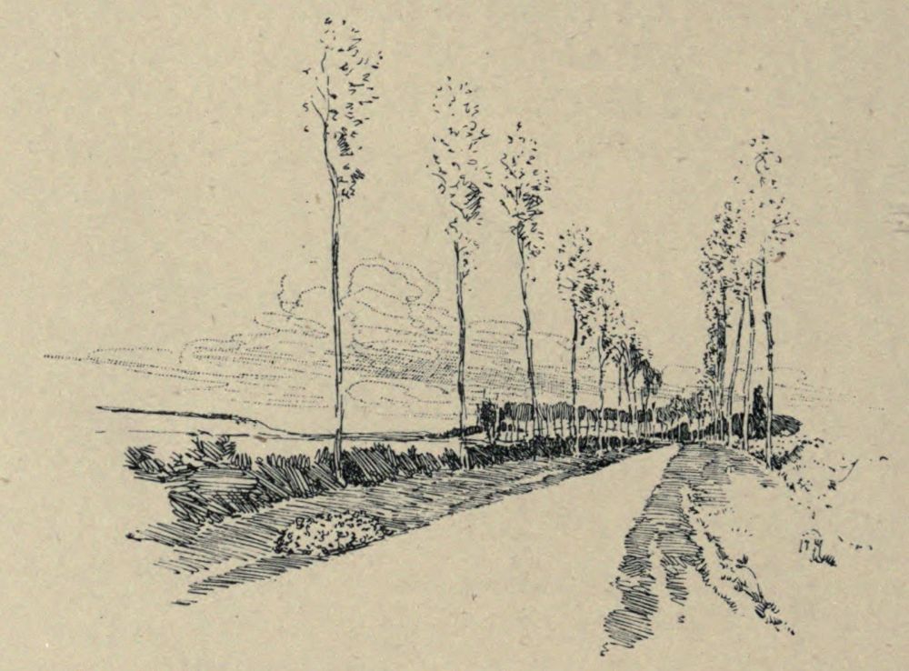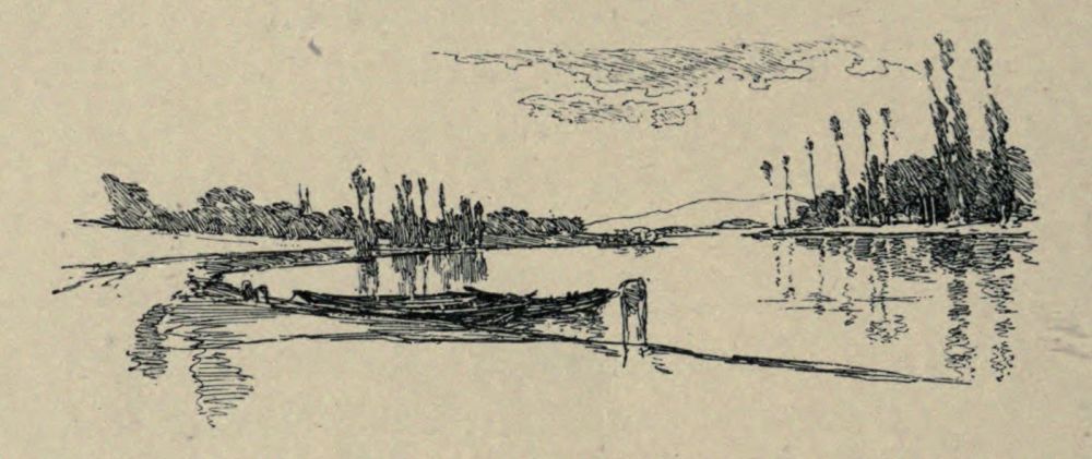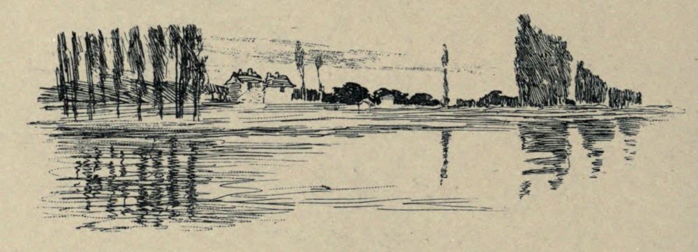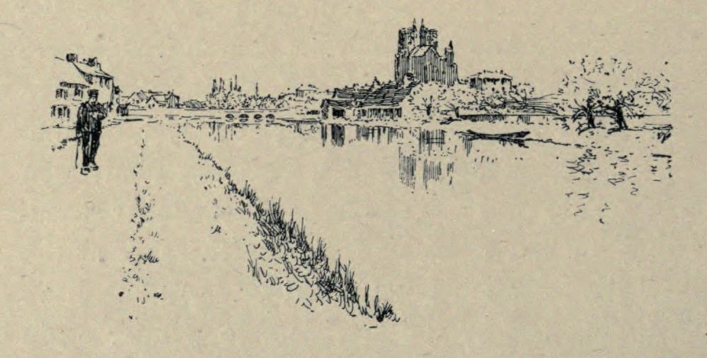 The morning was cool, the sky grey with heavy clouds, and the south wind we were soon to dread was blowing softly. It seemed a matter of course, since we were in France, that we should come out almost at once on a little river. It ran in a long line between reeds, towards a cluster of red-roofed cottages, and here and there fishermen sat, or stood, on the banks. When it forsook its straight course, the road and the street-car track from[30]