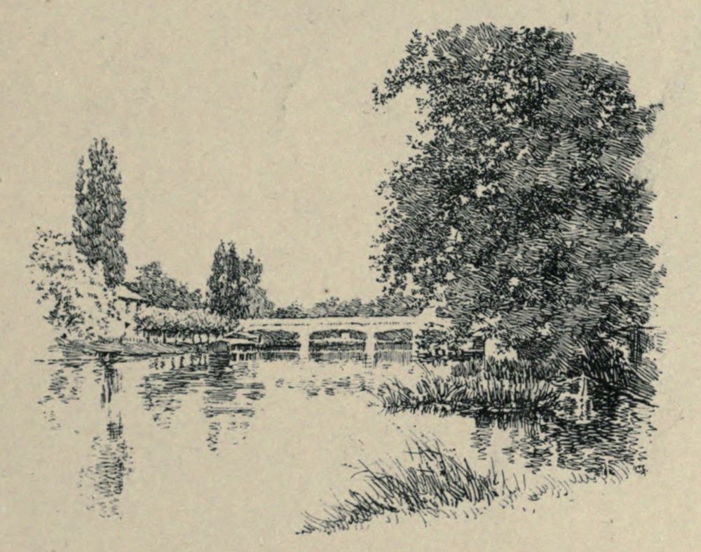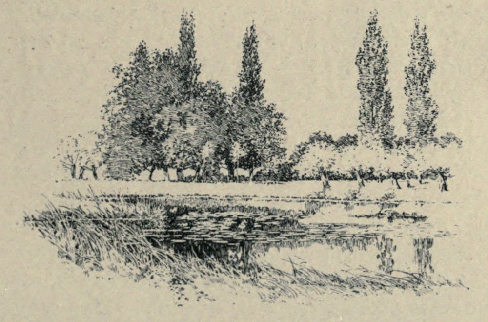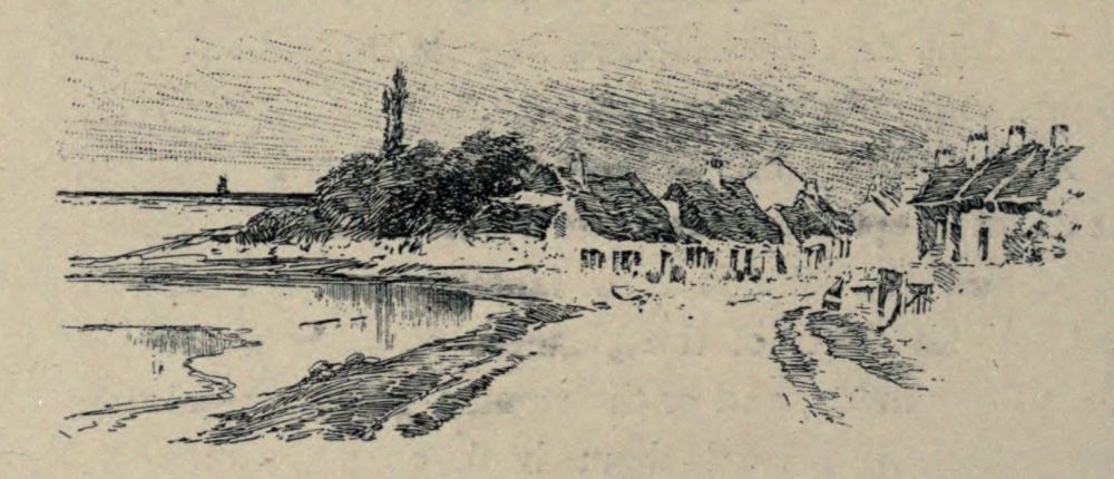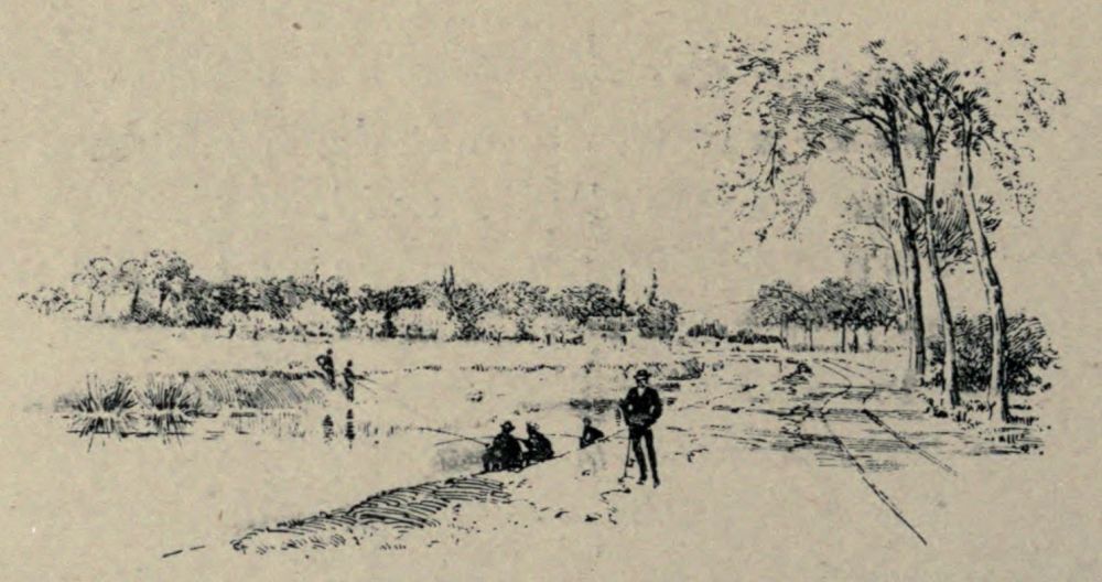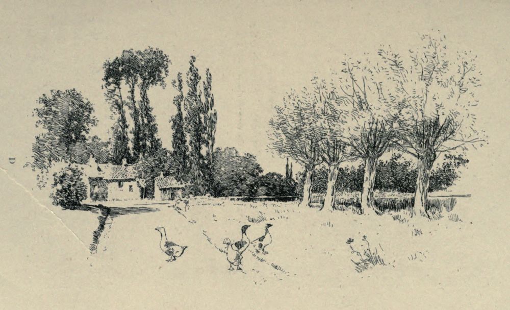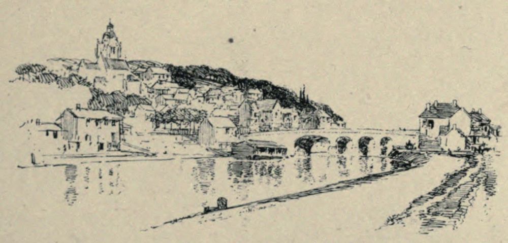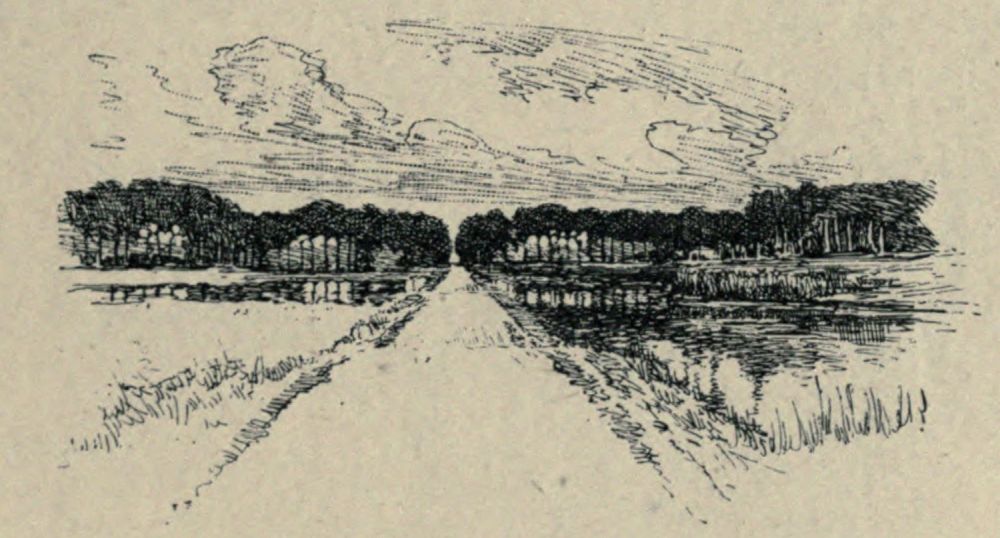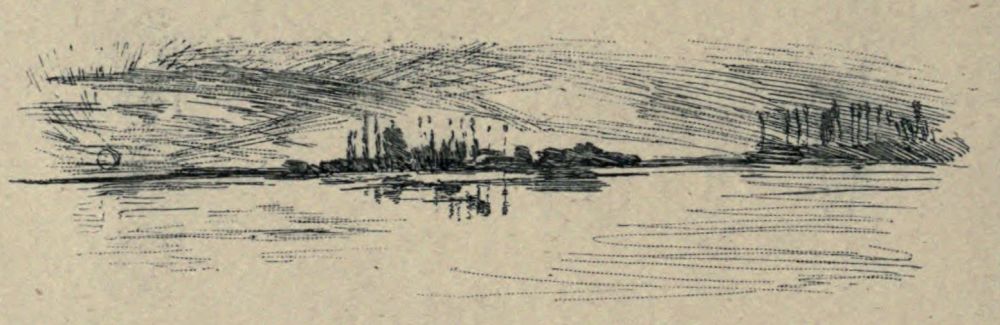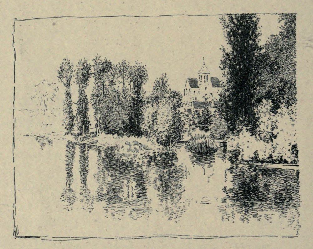 The morning was cool, the sky grey with heavy clouds, and the south wind we were soon to dread was blowing softly. It seemed a matter of course, since we were in France, that we should come out almost at once on a little river. It ran in a long line between reeds, towards a cluster of red-roofed cottages, and here and there fishermen sat, or stood, on the banks. When it forsook its straight course, the road and the street-car track from[30]