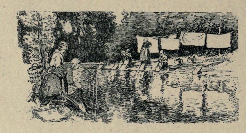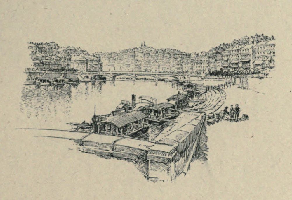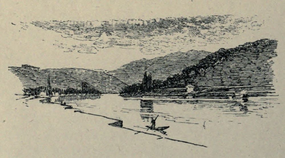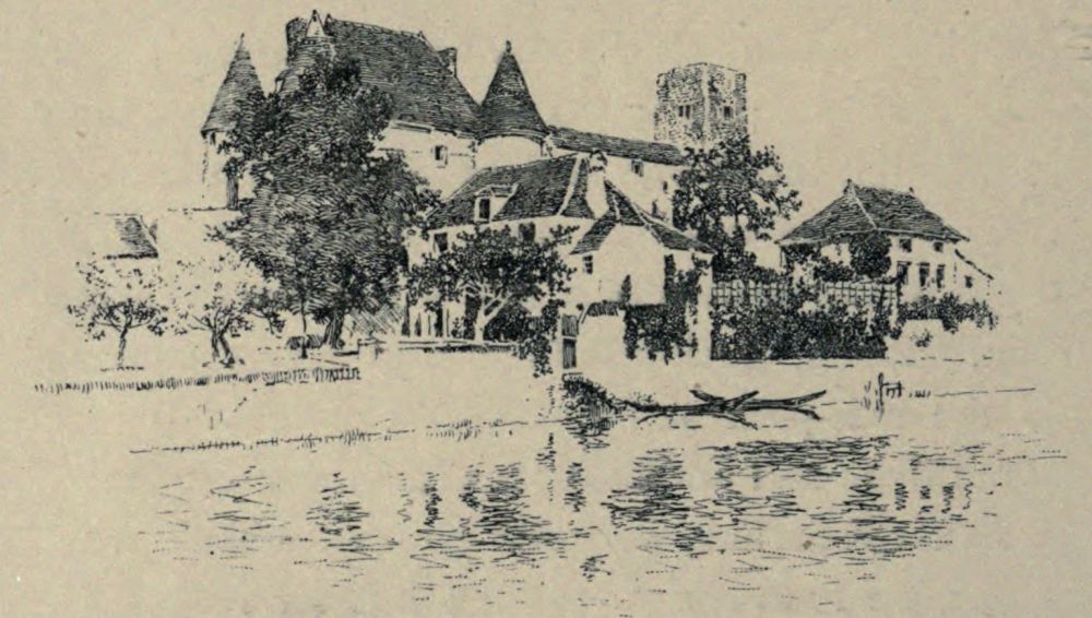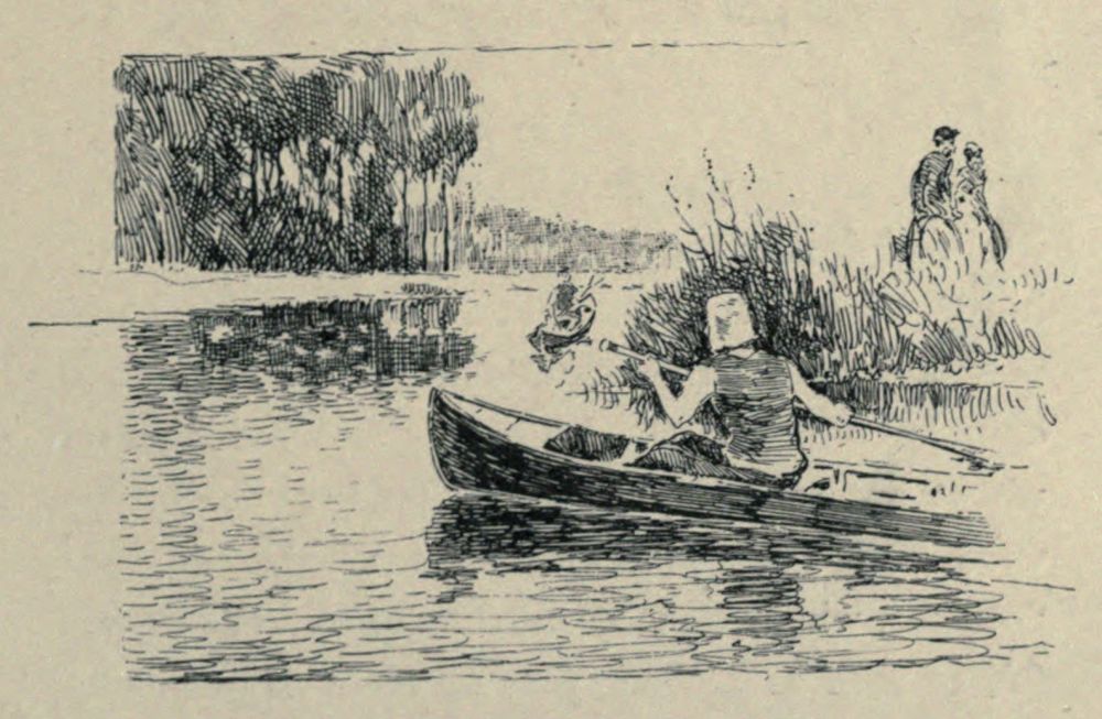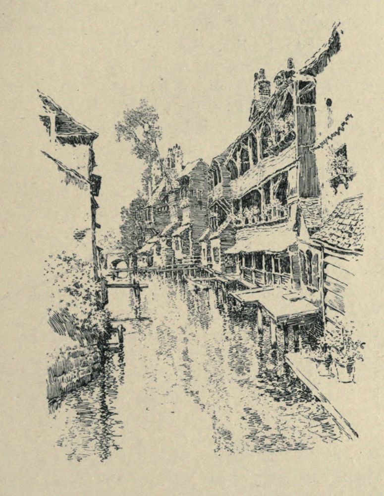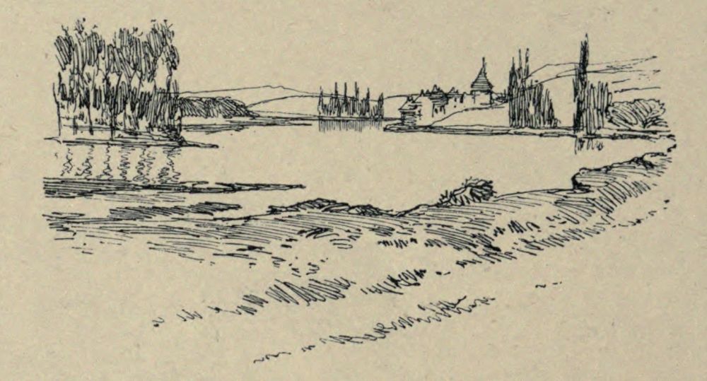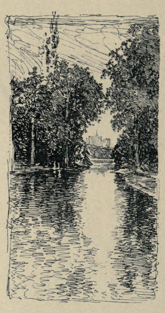 The morning was cool, the sky grey with heavy clouds, and the south wind we were soon to dread was blowing softly. It seemed a matter of course, since we were in France, that we should come out almost at once on a little river. It ran in a long line between reeds, towards a cluster of red-roofed cottages, and here and there fishermen sat, or stood, on the banks. When it forsook its straight course, the road and the street-car track from[30]