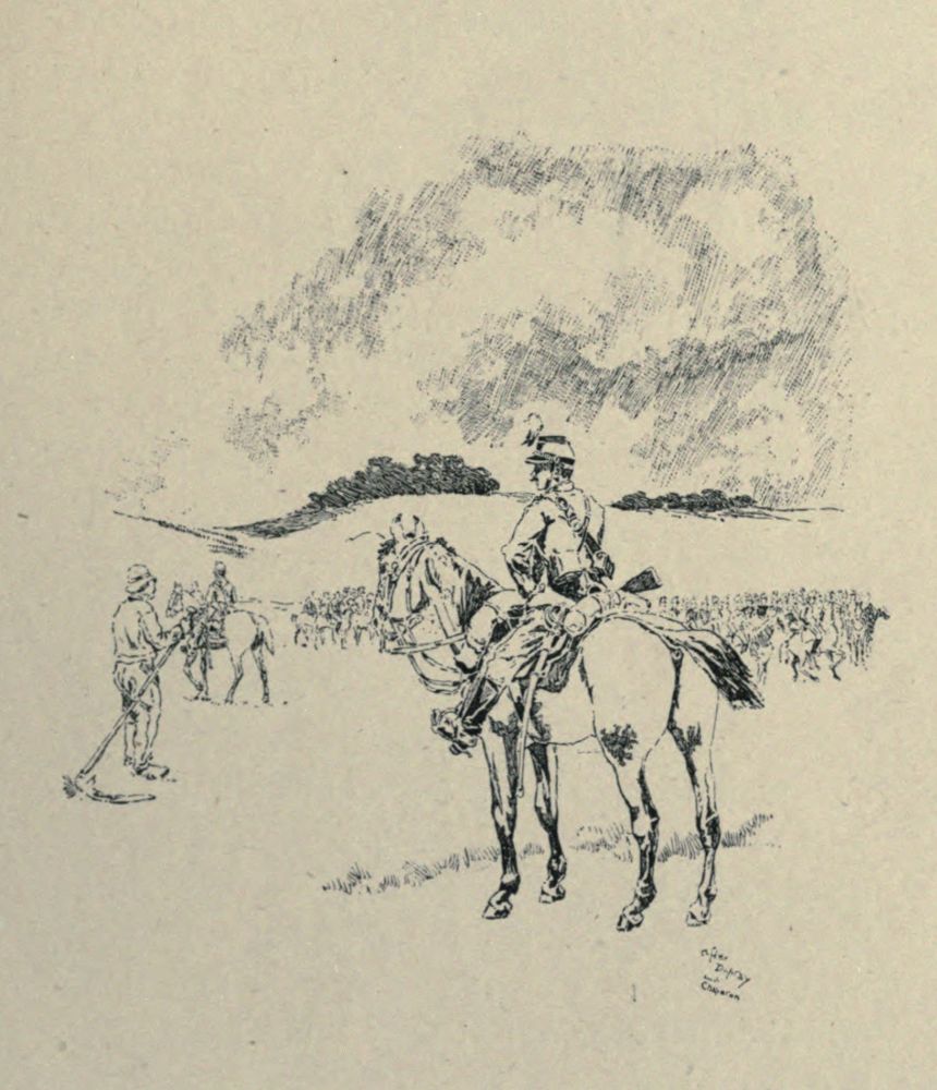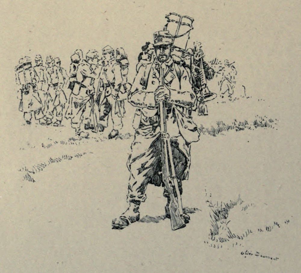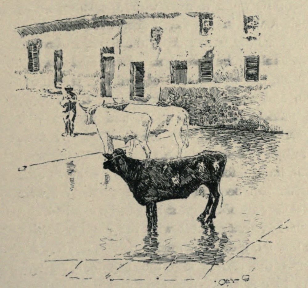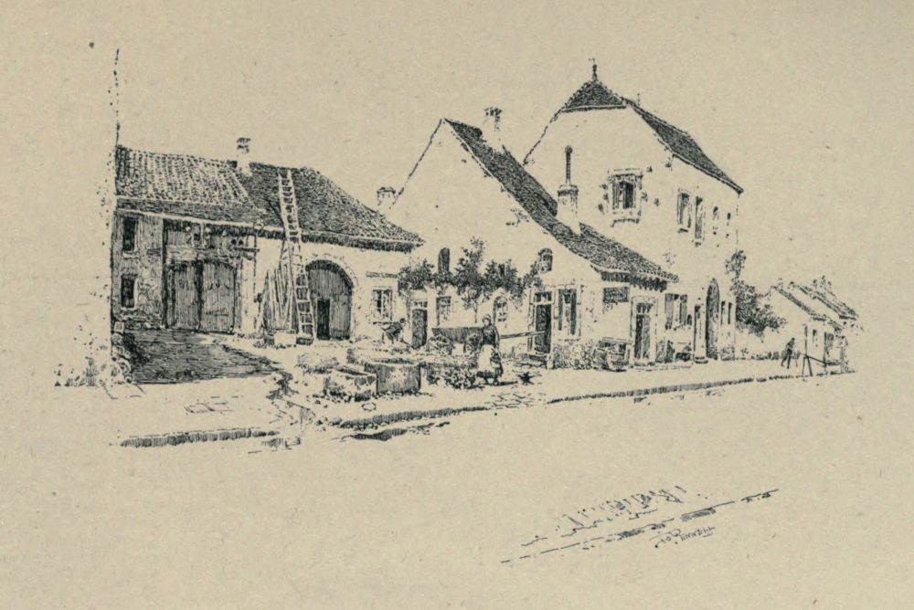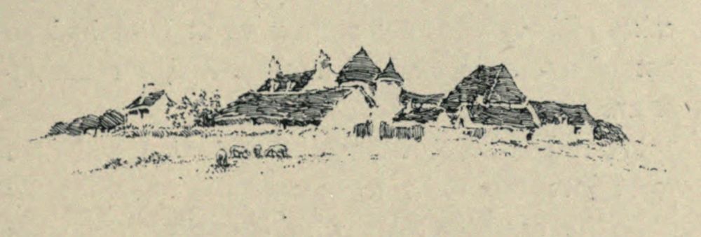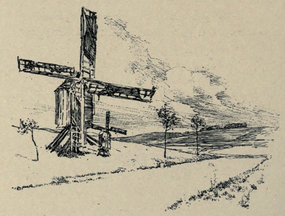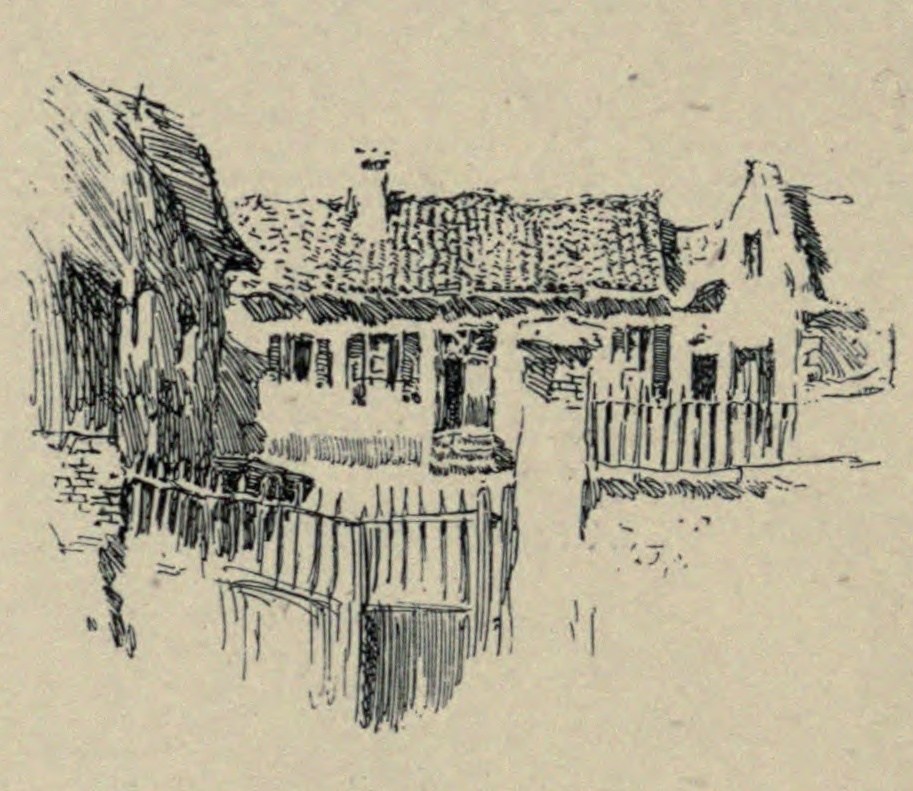 Sometimes I rode, for each tiny village nestled in a valley of its own, giving us a hill to coast as well as to climb. There were occasional windmills in the distance; and close to the road large farm-houses and barns, with high sloping red roofs and huge troughs in front, where we knew cattle would come in the twilight and horses[33] would be watered in the morning. And when Calais, with smoking chimneys, was far behind and below, we came to black crosses by the wayside and better manners among the people. The peasants now wished us good day.