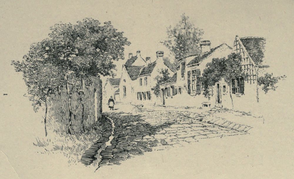 Calais went winding with it,—grassy plains, where cows and horses wandered, stretching seaward on the right. In front we looked to a low range of blue hills, that gradually took more definite shape and colour as we rode. They were very near when we came to Guignes, a silent, modest little village, for all its royal associations and memories of the “Field of the Cloth of Gold.” On its outskirts old yellow houses rose right on the river’s edge; and when we passed, a girl in blue skirt stood in one doorway, sending a bright reflection into the grey water, and in another an old man peacefully smoked his pipe, taking it from his mouth to beg we would carry packets for him to Paris. Behind one cottage, in the garden among the apple-trees, was a large canal boat, like a French Rudder Grange. Beyond, high steep-roofed houses faced upon the street, and the[31] stream was lined with many barges.—But just here we turned from river and street-car track to walk to the other end of the town, over pavé and up a steep hill, where we were told by a blushing young man, in foreign English, that we had but to follow the diligence then behind us if we would reach Marquise.