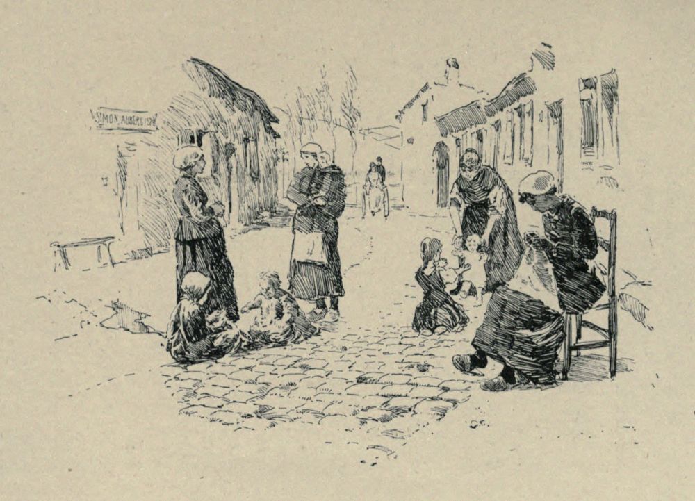 We soon discovered that it was a fête day in Calais, and that a regatta was being held down by the pier.—When we were there three Frenchmen in jockey-caps were pulling long out-riggers against the wind over a chopping sea. Looking on was a great[25] crowd, sad-coloured in the grey afternoon light, for all its holiday dress, but touched here and there with white by the caps—their wide fluted borders blowing back on the breeze—of the peasant women.