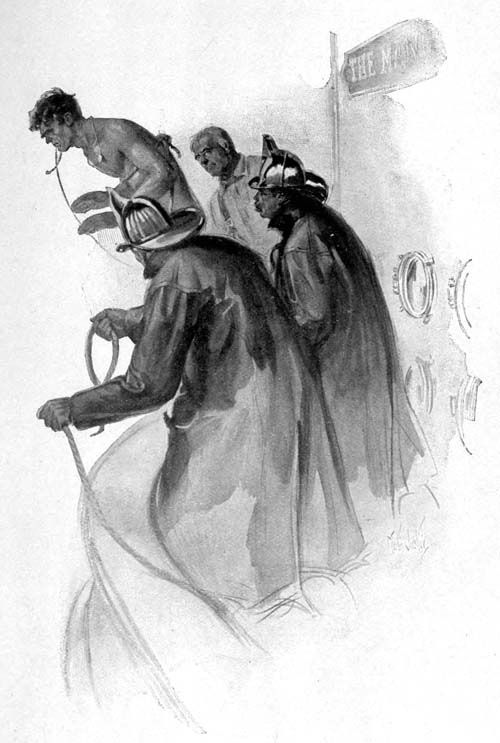 Moore ordered Farley to go below decks and warn Captain Keighley and[Pg 17] the squad in the hold. Farley glanced at his fellows; they were all partisans of the captain; they had been chafing under Moore’s attacks on him, and they were contemptuous of the lieutenant for the way in which he had mishandled the pierhouse blaze. Moreover, there were only four of them to two lines of hose; and the one unnecessary man there, as they saw the situation, was Moore. Let him go himself.