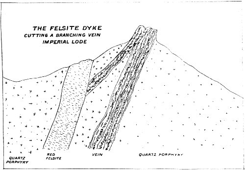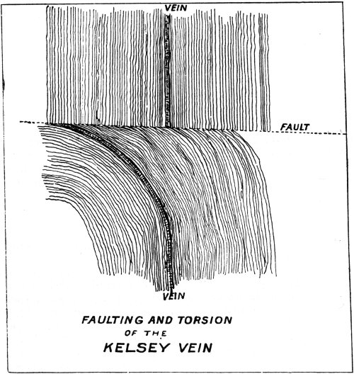 The rocks inclosing the vein differ in various parts of the mine. A much decomposed rock, containing iron in the form of carbonate, occurs frequently, while a chloritic, more or less schistose, sometimes massive, 5 rock, also plays an important part in this connection. The dike of dark basic rock, resembling diorite, previously referred to, is exposed at numerous places throughout the workings, often in contact with the vein, or close to it. Since its formation the Kelsey vein has been subjected to severe torsion, which has resulted in abrupt fracture and displacement. To me it seemed very probable that the vein was the result of chemical precipitation, and no doubt, to some extent, the replacement of country rock along the line of a fissure or fault plane; that subsequent to the filling in of the vein the region was subjected to further violent disturbances, which fractured the rocks along an east and west course, and causing the turning of a large mass of rock formation lying south of this fault to the west. The vein being included in the general movement, was deflected from its natural course north and south. I came to these conclusions from close observations taken along the surface of the ground on the course of the vein, and in all accessible underground workings.
