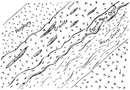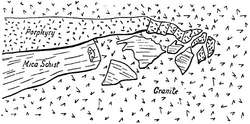 Near the foot of the grade, 2 miles east of Jamul Post Office, this rock 16 is very coarse, with large hornblende crystals. It extends out in the form of arms or dikes into the adjoining granitic rocks. This rock is very tough and heavy. Gneiss outcrops for 2 miles westward. It varies between thin-bedded micaceous strata and thick-bedded, almost granitic forms. It strikes north 15° east, dips 70° to 80° east. Farther down, toward the Oakdale House, this is replaced by coarse eruptive granites. Just below the Oakdale House there is a very interesting contact between granite, quartz porphyry, and diabase. The first rock exposed below the house is a rather dark micaceous syenite. Beyond this the rock becomes coarser, containing large grains of quartz and glassy feldspar, with inclusions of a very dark diabasic rock. In a little cañon which comes down to the road from the east, this rock comes into contact with one which varies from a feldspathic mica schist, through a gneiss, to a quartz porphyry. The junction is very irregular and the two rocks are slightly mixed; sometimes branches of the syenite are partly inclosed in the porphyry. Some portions of the syenite show gas pores, or spaces left at the time of consolidation, one fourth to one half an inch in diameter. They are partly filled with secondary quartz. The next rock exposed up the cañon is a mica schist; strike 15° west, dip vertical. Quartz porphyry follows this, then an irregular dike of granite, in which are imbedded nodules of quartz porphyry, some nearly a foot in diameter. Above the granite there appears a granitoid gneiss, with many cavities, arranged with their longer axes parallel to the schistose structure. This changes into a coarse, knotty granite, containing large nodules of dark petrosilex. A slight blending is noticeable. Farther up this is succeeded by a micaceous quartz feldspar porphyry, showing a somewhat gneissoid structure. It is out at right angles to this structure by jointing planes lying thickly together. It has a milky, vitreous luster, and contains inclusions of very coarse granite. The next rock exposed is a diabase 200 feet across. It is coarse in the middle and aphanitic on the edges. Adjoining it are bunches of granite and a fine, dark, compact mica schist, showing traces of little pebbles in places. The schist changes to a petrosilex, which comes in contact with a dike of very coarse granite. At the upper edge of this granite outcrop, and inclosed in it, is a stratum of fine, dark mica schist and a dike of quartz porphyry. At one end these inclusions are hidden, but at the other they have been bent, fractured, and the pieces separated some distance in the granite. (Fig. 9). This is a most interesting example of the intrusive nature of the granite.