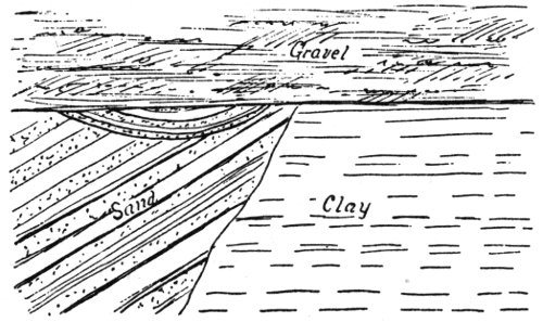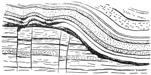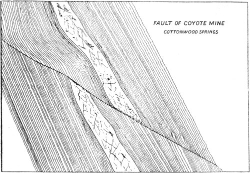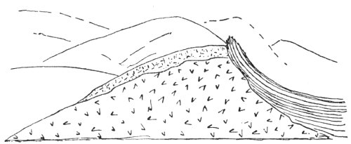 At Palm Springs the soft clay beds of late Tertiary age begin to appear. They dip in all directions, though that to the south and southwest is the most common. Toward Carrizo Station these are often covered by granitic detritus. The Tertiary beds widen out where the road strikes Carrizo Creek, and at Carrizo Station they have a width of nearly 10 miles. They rest against a granite range north of the creek and south along a long ridge which terminates in Carrizo Mountain. They also extend a long distance up Carrizo Creek. Four miles below the station harder sandstones and strata of shells cap the clay hills. This shell layer near the creek is 10 feet thick and contains pectens and oyster shells, belonging to the Miocene-Tertiary. The clay hills which surround Carrizo Station form a veritable Bad-Land. They show many different colors, and are perfectly devoid of any vegetation. They have been eroded into a most confused network of hills and cañons, and are so soft that it is difficult to travel over them. Six miles below this station and a mile north of the creek there rises a rugged granite range, facing the open desert. It rises from the desert quite precipitously nearly 2,000 feet, but blends westward into the ridges which run east from San Felipe. The granite is coarse and deeply decomposed. Sharp, angular grains of quartz stand out so prominently as to tear anything with which they come in contact. The thin-bedded shell strata rest against the slopes of the mountain, and near the southern end rise against the eastern slope at a very high angle in sharp, jagged points. These strata rise above the granite ridges at the point where they occur, and dip fully 70° to the east. (Fig. 11.) Resting on the summit of this granite ridge, and immediately west of the steeply inclined and jagged points of the Tertiary strata, is the southern outcrop of a bed of coarse, hard sandstone, which rises along the summit of the ridges to the north and dips west, extending down the western side of the range for a thousand feet or more, dipping at an angle of about 30°. This sandstone outcrops along the crest of the ridge for nearly a mile. It is, however, not absolutely 21 continuous, the granite rising through it in places. Near the southern end it is so highly metamorphosed as to be with difficulty distinguished from the granite at the contact. In fact, the two formations have become so intimately united, that a fracture of the granite made near the sandstone, instead of stopping at the contact, extends into the sandstone, so that the two rocks break off together. The contact is so exceedingly irregular that it seemed at first sight as if the sandstone had been intruded by the granite. Deep, narrow crevices extend into the granite, and are filled with sandstone. Some granite bunches are almost inclosed in the sandstone. The most interesting feature of this sandstone is the presence in it of an abundance of well-preserved corals of a type fully as old as the Cretaceous. Fragments of two species of a large oyster and poorly preserved specimens of univalve and bivalve shells are also abundant. There are at least two species of coral, many specimens being at least a foot in diameter. The sandstone is literally filled with them toward the southern portion of the outcrop. They also extend down into the crevices and cavities in the granite. The sandstone shows somewhat less metamorphism toward the north, where it contains some strata of pebbly conglomerate. The granite is intersected by many veins of coarsely crystallized feldspar and quartz. From these veins many of the pebbles in the conglomerate have been derived. At the highest point of the ridge the sandstone has the greatest thickness. Here it is broken up into great blocks 15 feet square, piled in the greatest confusion, as if by an earthquake. One great mass overhangs the almost precipitous granite escarpment at an elevation of 1,000 feet above the desert. Many fractures extend from the sandstones through into the granite. The sandstones, as well as the granite mountains north, have been baked a dull red color by the intense heat of the sun. To account for the peculiar position of this sandstone, as well as the steep inclination of the Tertiary beds at the southern end of the mountain, we must suppose that an extensive fault has taken place along the edge of the range facing the desert. The general inclination of the Tertiary beds to the west and southwest is also evidence of an uplift along this line.