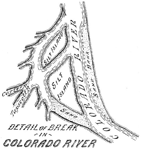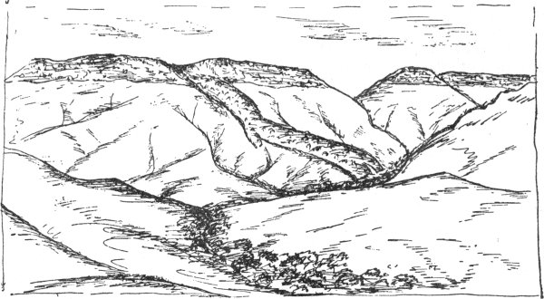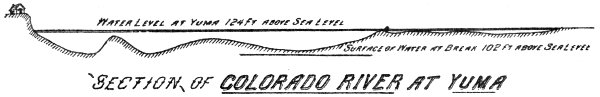 As the cañon opens out to the desert, hills appear on either side formed of volcanic tuffs. They dip northeast 30°. Underneath is a sandstone wholly unconsolidated and dipping in the same direction 40°. This contains no lava pebbles. The fragments of the tuff are quite varied in character and generally quite angular. They are imbedded in a volcanic mud, free from granitic detritus. In some of the strata appear thin beds of lava, seeming to represent a flow. These tufa hills extend northwesterly along the base of the granite mountains for 10 miles or more. It is not known how far they go in a southerly direction. In places they form mountains of considerable size high up on the side of the range. The range of mountains between this point and Carrizo Creek appears also to have some volcanic beds on its southern slope. The open desert at the foot of the mountains has an elevation of 1,200 feet. It slopes gently for miles in an easterly direction and consists largely of loose sand.