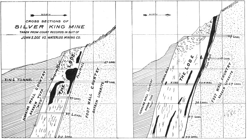 The Ore.—The silver occurs as native and as glance (argentite), possibly partly as chloride and in combinations with sulphur, cobalt, and arsenic. The associated minerals are cobalt bloom (erythrite), a hydrous cobalt arsenate, nickel arsenate (annabergite), carbonate and silicate of copper (chrysocolla), iron oxide, and black oxide of manganese in a gangue of baryta (heavy spar), with calcite (lime spar) and some quartz. A clay selvage usually separates the vein material from the wall, this feature being well developed in places on the foot wall side, as though open crevices had occurred and the finely divided material which was carried by the percolating waters had found a resting place when an open space was reached, the absence of any current permitting the material to settle.