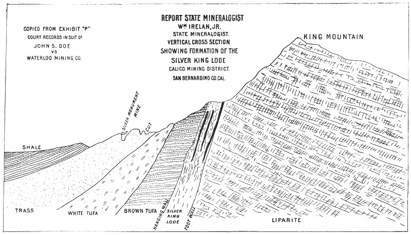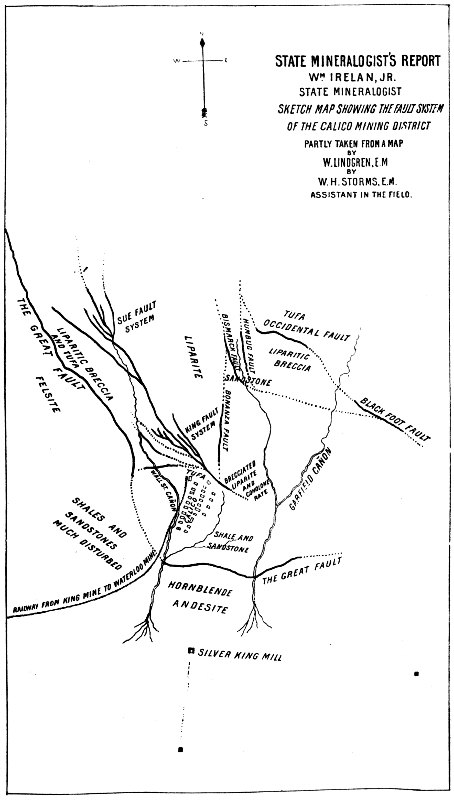 In the region about Acton are many hills of liparite (quartz-bearing trachyte) and tufa, which are identical with the rhyolites of the Calico region—the same violet-brown, porphyritic liparite; the same pea-green and buff-colored tufas; the same conglomerate; in fact, an exact facsimile of the Calico range. There are no great beds of sedimentary rock, however, and these liparite hills are comparatively small, isolated masses. As far as my knowledge goes ores of silver have never been found in these rocks in the Acton district. Careful prospecting may possibly discover such ores.