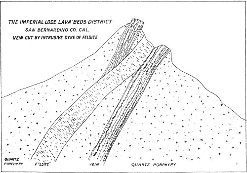 The diabase is cut by small, interlacing granite seams for 6 or 8 feet, and also contains some large, irregular, lenticular masses of the same rock. Still farther is another dark dike cut squarely across by granite. Fine granite and quartz porphyry dikes occur still farther east. The porphyry dikes all run about north 35° west, average dip 70° southwest. They extend along the summit of a ridge for more than half a mile, when the coarse granite becomes the country rock. On the summit of the hill at the head of the cañon are strata of metamorphic rock, and also some veins of pegmatite, cutting across the porphyry. This wonderfully varied succession of rocks does not cover a width of more than a quarter of a mile. The relations exhibited here prove that the porphyry and diabase, as well as the schists, are older than the granite. The strip of country between the ancient porphyries of San Miguel and the coarse granite of Lyon’s Peak and the ranges north is remarkably rich in its variety of intrusive rocks.