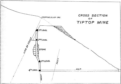 The vein is of the fissure type and occupies the line of a fault plane, that at first, perhaps, was a mere crack, but which has become enlarged by the movement upon themselves of the rock masses forming the walls, resulting in a grinding and crushing of the rocks by the attrition and pressure incident to this movement. Into this crevice mineral waters found their way, carrying in solution the minerals now constituting the vein.