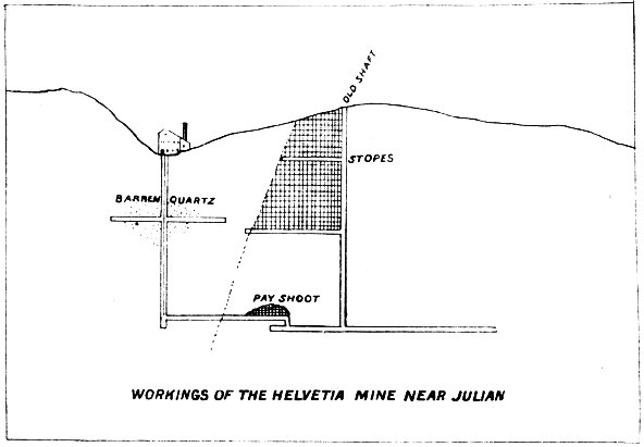 The Pine Valley district lies in a belt of gneissose, mica schist, and quartzose rocks, which extend in a direction a little west of north. They begin about 2 miles south of Pine Creek and extend, probably unbroken, through to Banner and Julian. It is 4 miles north to the Deer Park district. The metamorphic schists widen as this district is approached. They extend from the desert slope to Deer Park, where a body of diorite has been intruded, and from there westward 2 miles to the Cuyamaca grant. A half mile west of the camp the slaty mica schists and quartzites are well defined. A vein of gold-bearing quartz has been traced for several miles in these rocks, and a number of locations have been made on it. The strike is north and south, dip 80° to the east. A body of white crystalline limestone lies in this formation, about 1½ miles southwest of Deer Park. The body of micaceous diorite which extends through this camp is about a mile long, and is quite gneissoid in places. Near its southern end it incloses narrow bands of hornblendic and feldspathic rock, containing garnets. The veins are numerous in this diorite, and extend in every conceivable direction. The diorite has been greatly crushed at some time, with fissures in every direction; hence, the irregularity of the quartz veins. The veins are generally bunchy, and not often very large. They seem simply to follow the exceedingly irregular fracturing of the diorite, which is decomposed to a considerable depth. The work thus far in this district has been confined to the surface, so that nothing can be said in regard to the permanency of the veins. The elevation of the camp is 4,600 feet.