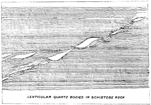 The country is made up almost entirely of metamorphic rocks, having schistose, gneissoid, and massive structure. Both hornblende and mica occur in these rocks abundantly, the former being frequently altered to chlorite, or by further change to epidote. Dikes of porphyritic rock have been intruded into the crystalline schists. In the immediate vicinity of the Kelsey vein are intrusions of a dark green, much decomposed, and shattered rock, probably diorite. Faults, great and small, are numerous throughout the region. Within a few hundred feet of the mine is a great fault, which may be plainly seen cutting the mountain. The displacement must reach many hundreds of feet. It has resulted in bringing in contact on a horizontal plane rocks of entirely different character. On the south side of the fault the rocks are made up of quite regularly bedded micaceous sandstones, more or less schistose, and having a prevailing buff or light gray color. These rocks dip east at an angle of 20° to 30°. On the north side of the fault the rocks are harder, of a dark gray color, and containing considerable hornblende. These rocks are more gneissoid and massive than schistose. The dip is much less regular than on the south side of the displacement. Large, lenticular masses of quartzose and feldspathic rock are of frequent occurrence in the hornblende gneiss, evidently the result of the segregation of the contained minerals. On the whole there is much more evidence of the disturbance on the north side of the fault than on the south side. It is in this area of greatly disturbed strata that the Kelsey vein has formed.