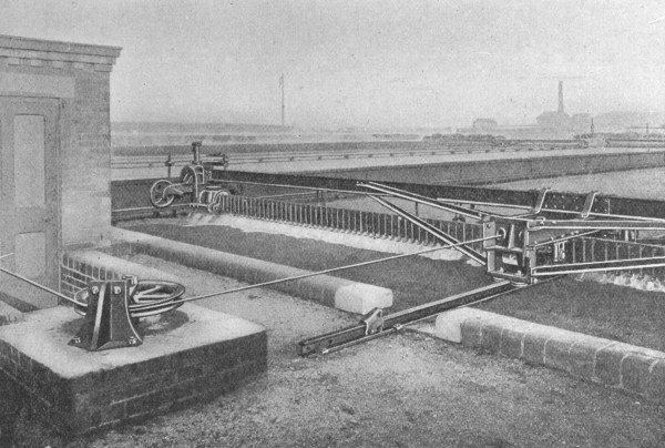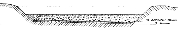 The function of these tanks is to arrest all mineral matter, such as stones, sand, road-grit, and similar substances which cannot be decomposed in the subsequent stages of treatment, and would thus choke the tanks and filters. The essential factor in their operation is a reduction of the rate of flow of the sewage, so that all matters of a greater specific gravity than the water and the organic matters in suspension may be deposited by subsidence. At the same time the velocity should not be reduced to such an extent as to allow the organic matters in suspension to settle out, as these can be more suitably dealt with in the subsequent tanks provided for that purpose. From this it will be seen that considerable care is needed in designing these tanks if they are to have the desired effect. Further, it is very essential that every facility shall be provided for removing the matters which are deposited with as little trouble as possible.
