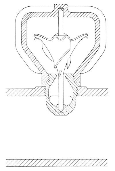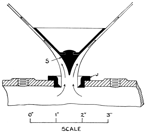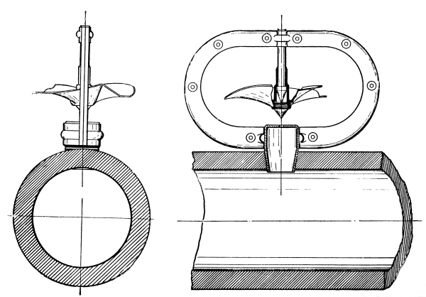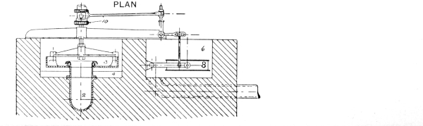 Diverting Plate.—Many ingenious devices have been adopted in the past for the purpose of ensuring the diversion of all the excess volume above a certain fixed quantity. One of these is shown in Fig. 9, where it is assumed that all in excess of the volume which is taken by the sewer flowing four-fifths full is to be discharged over the overflow. In order to facilitate this result, an iron plate is fixed at the level of the weir (say four-fifths of the diameter of the sewer), over the whole of the outlet end of the chamber or man-hole, with a sharp edge on the side facing the flow, so that when the sewage in the chamber rises above this level, the excess volume above that flowing at a depth of four-fifths of the diameter of the sewer, is automatically diverted by the plate and caused to pass away over the weir. The invert of the chamber must naturally correspond with the diameter of the sewer.
