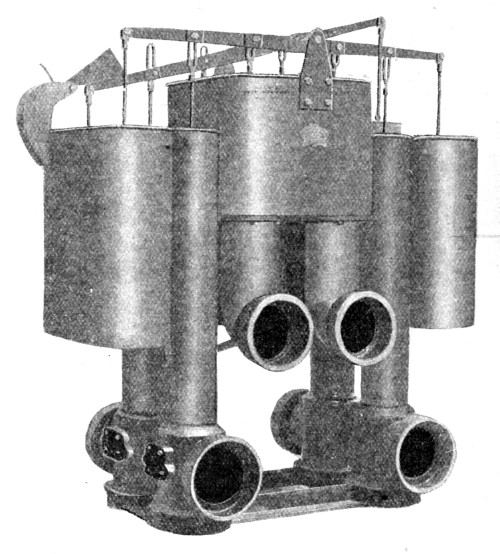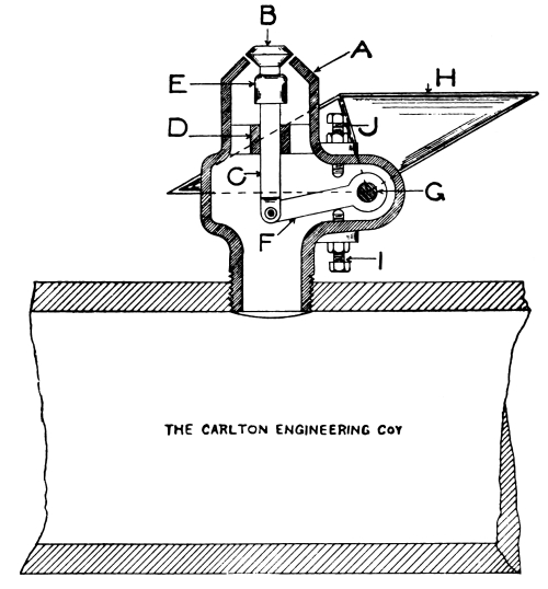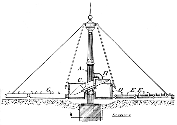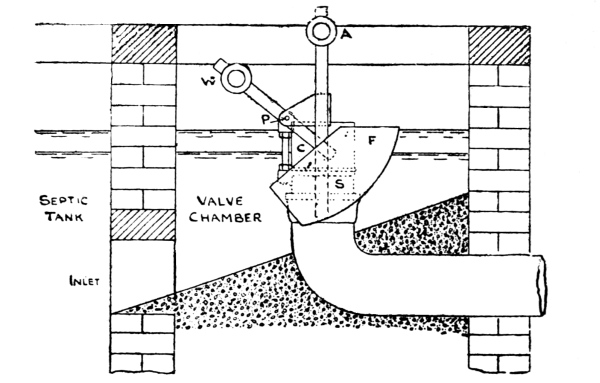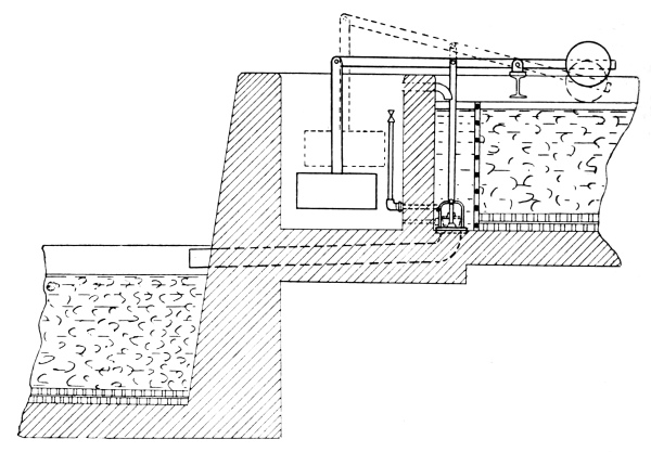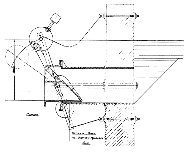 21 Movable Weirs.—If, however, it is desired to provide for an absolutely correct diversion of the storm-water, this can only be done by the use of a movable weir. There are two types of this form of weir on the market at present, both manufactured by Messrs. Adams Hydraulics, Ltd. Fig. 11 shows a floating weir, circular in form, arranged by means of floats to rise and fall freely with the level of the sewage in the chamber. The joint between the fixed and moving portions of the apparatus consists of an air-lock, and is thus frictionless. The floats are adjusted to bring the lip of the weir at such a depth below the top water level, that the volume which can pass over the weir without raising it is the maximum volume which it is desired to pass to the tanks and filters. As soon as the flow of sewage exceeds this volume, it naturally causes the floats to raise the lip of 22 the weir, and in this way the volume passing to the tanks and filters can never exceed the predetermined fixed volume, and all in excess must pass over the overflow weir. Fig. 12 shows a swinging syphon, which has the same effect as the floating weir. In this case the syphon has both legs trapped, so that it acts as a continuous syphon, and it is pivoted on the top of the division wall to swing freely. To the inlet leg, on the sewer side of the division wall, is attached an adjustable float, of sufficient buoyancy to raise this leg of the syphon (and with it the outlet leg as well) as the sewage rises in the chamber. It will be seen that the difference in level between the lip of the inlet leg and the buoyancy point of the float, represents the head which controls the maximum rate of flow through the syphon, and that immediately this is exceeded the float rises, and with it the syphon leg, so that all the excess volume of sewage, above the fixed maximum rate of flow through the syphon, must of necessity pass over the storm-water overflow weir.