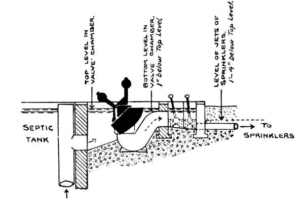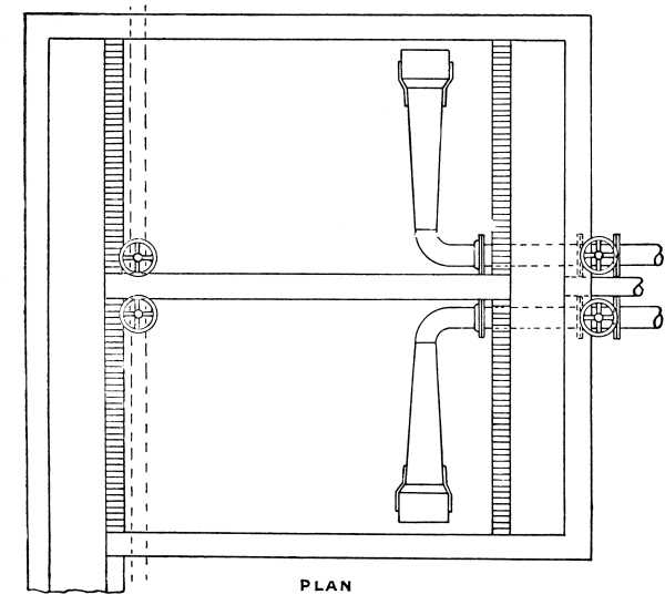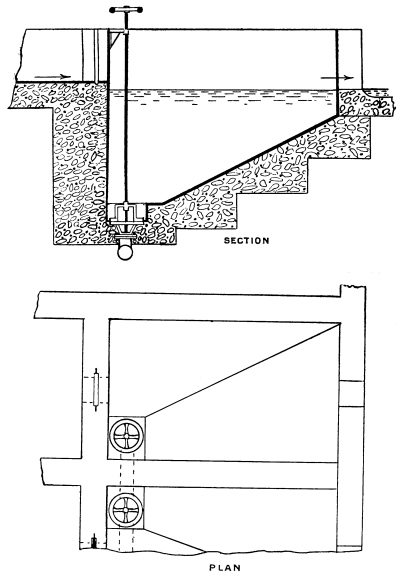 Capacity of Detritus Tanks.—Too frequently there is very little evidence of design in these tanks, especially in the provision of suitable sludge outlets. Before all, there should be at least two detritus tanks in every case, so that one may remain in work while the other is being cleaned out, and, if the recommendations of the Royal Commission on Sewage Disposal are followed, each should have a capacity of not less than one-hundredth of the daily dry-weather flow. A simple 24 form of detritus tank is shown in Fig. 13. The essential features are, a floor with a sharp fall towards the inlet end of the tank and a sludge outlet at its lowest point. In this case a sludge plug valve is shown. This is suitable for all cases where the sludge can be 25 discharged to the sludge bed by gravitation. Where the levels do not permit of this, and it becomes necessary to raise the sludge, a chain-pump may be fixed in the detritus tank itself. As, however, this would involve a separate chain-pump for each detritus tank, as well as for each of the other subsequent tanks, it is usually found more convenient in such cases to construct a separate sludge-well provided with a chain-pump, and arranged at such a depth that the sludge from all the tanks will reach it by gravitation. This arrangement will be shown later in connection with the sedimentation tanks. The inlets to detritus tanks must be provided with valves, so that the flow of sewage may be shut off when it becomes necessary to empty the tanks. In order to prevent any misuse of these valves either in error, or wilfully, by closing both simultaneously and thus causing the whole of the sewage to pass over the storm-water overflow weir, the inlet valves should consist of grooved frames with one interchangeable door. By this means it is impossible for anyone to close both inlets at the same time.