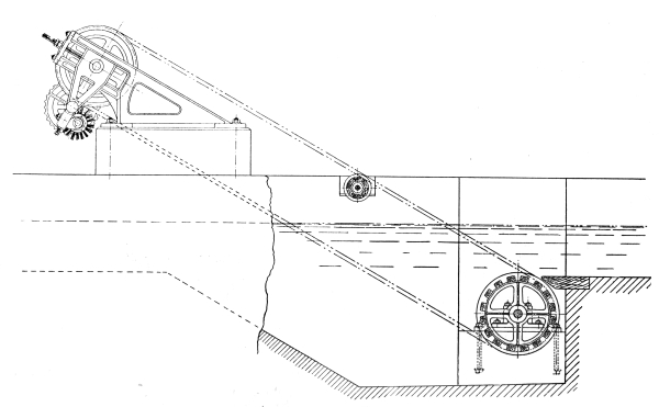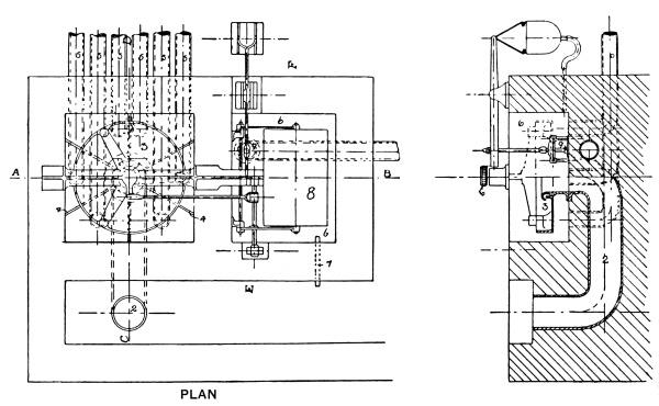 Rotary Screens.—Where the flow of sewage is sufficient for the purpose, and it is desired to reduce the necessary attention to the minimum, the self-cleansing rotary screen, manufactured by Messrs. John Smith and Co., may be adopted. This is illustrated in Fig. 2, from which it will be seen that it consists of a revolving wire screen, 6 extended between two rollers, one below and the other above the sewage level. The upper roller is rotated by means of a water wheel driven by the sewage. A rotary brush is fitted to the shaft and driven in the 7 opposite direction to the screen roller, so that it brushes off the screenings into a trough, from which they are removed by hand.