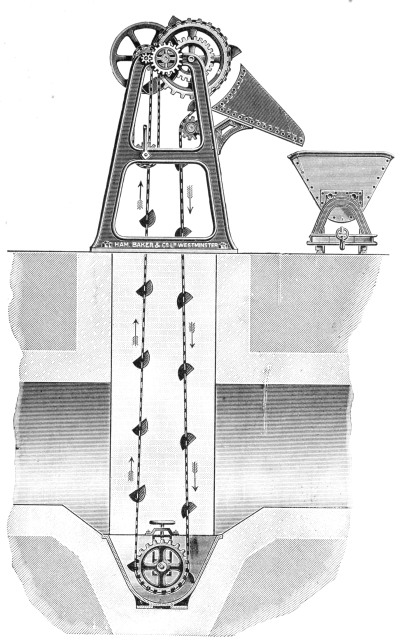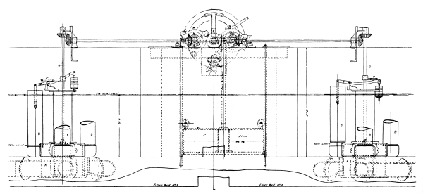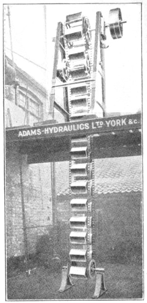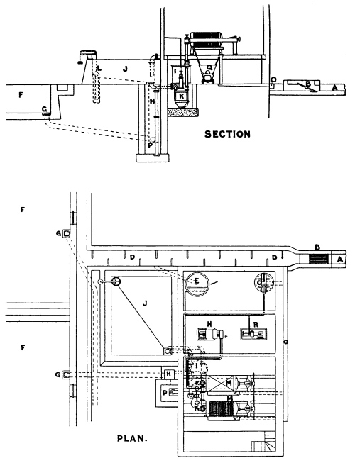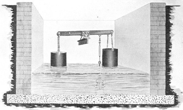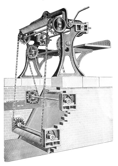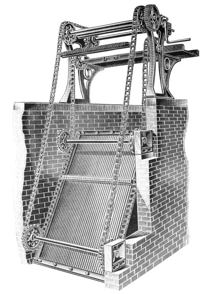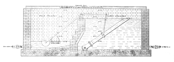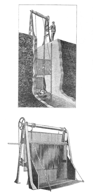 Screens for Deep Sewers.—In cases where the depth of the sewer makes it inconvenient to adopt a fixed screen, the double lifting screen, manufactured by Messrs. Adams Hydraulics Ltd., may be used, as shown in Fig. 3. This consists of duplicate screens, arranged to slide up and down in cast-iron guides attached to the walls of the chamber. These screens are raised and lowered by a chain, which passes over a drum revolved by hand. The main screen is in the form of a basket, with a hinged front, which falls to the floor of the chamber when this screen is lowered into position. When it is desired to clean out this basket screen, the other plain guard screen is lowered into position in front of the basket-screen, and the latter is then raised. As the chain by which the basket-screen is raised is attached to the top of the hinged front, the action of raising this screen first draws up the hinged front and this prevents the screenings falling out. After this screen has been emptied, it is again lowered into position, and the guard-screen raised to permit the sewage to flow direct into the basket-screen. 8