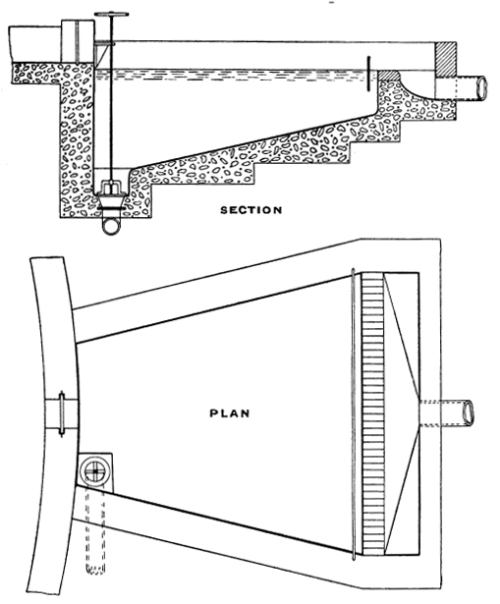 Another method of ensuring uniformity of flow over the whole area of a tank, is to arrange it in the form of a wedge, with the inlet at the 39 narrow end and the outlet in the form of a weir at the wide end. This form of tank is shown, Fig. 134, page 183, for settling out the humus in filter effluents. The same tank, with a greater depth, would be equally suitable as an ordinary sedimentation tank for sewage, and several could be arranged in such a way that three or four would form a half-circle, i.e. the angle between the two side walls of each tank would be 60 degrees or 45 degrees.
