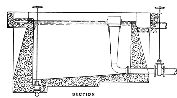 Substantial walls in brickwork, concrete, plain or reinforced, and of a suitable thickness to withstand with safety the pressures they are required to resist; sloping floors provided with suitable outlets for both liquid and solid contents at the bottom, and specially arranged inlets and outlets at the top. In connection with the floors, sufficient care has not always been devoted in the past to the consideration of the most convenient method to adopt, in view of the necessity of removing the sludge. In some cases, the floors have been laid with a slope towards the outlet end, and, as the greatest accumulation of deposit takes place at the inlet end, great difficulties have been experienced in removing the sludge. There is very little doubt that if suitable arrangements are made, by means of which the accumulation of solids deposited at the inlet ends of tanks can be removed without drawing off the total contents of the tank, much labour will be saved. With this end in view, the design illustrated in Fig. 16 is suggested as a model which may be adopted exactly as shown, or, with some modifications, adapted to meet the special requirements 33 of particular cases. It will be noticed that a submerged weir wall is introduced at some distance (which will vary with the method upon which the tank is operated and with the character of the sewage) from the inlet end of the tank, so as to retain the larger portion of the solids in this separate compartment. The floor of this section is laid with a comparatively steep gradient leading to the sludge outlet. A separate outlet, fitted with a floating arm, may be provided for drawing off the top water down to the level of the top of the weir wall. Below this level, in ordinary circumstances, only the contents of the separate compartment at the inlet end of the tank will be drawn off in removing the sludge. A valve is provided at the bottom of the weir wall, so that the entire contents of the tank may be drawn off should it be found necessary at long intervals. An alternative to the submerged weir wall is shown in Fig. 17, in the form of a division wall carried 34 up to the top of the tank, with orifices below the top water level through which the sewage passes when the tank is in use. These apertures are provided with valves, so that they may be closed when the solids in the compartment at the inlet end of the tank are drawn off, and thus obviate the necessity for emptying the whole of the tank.