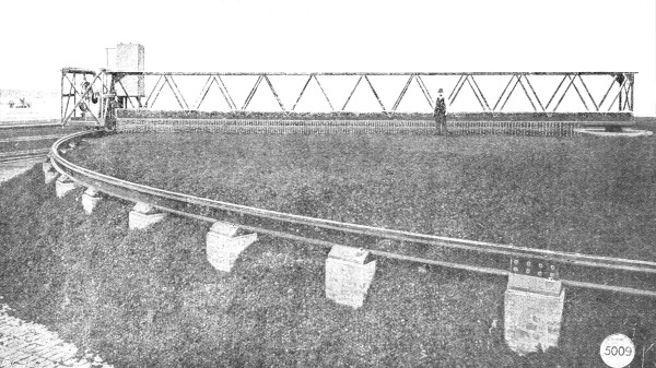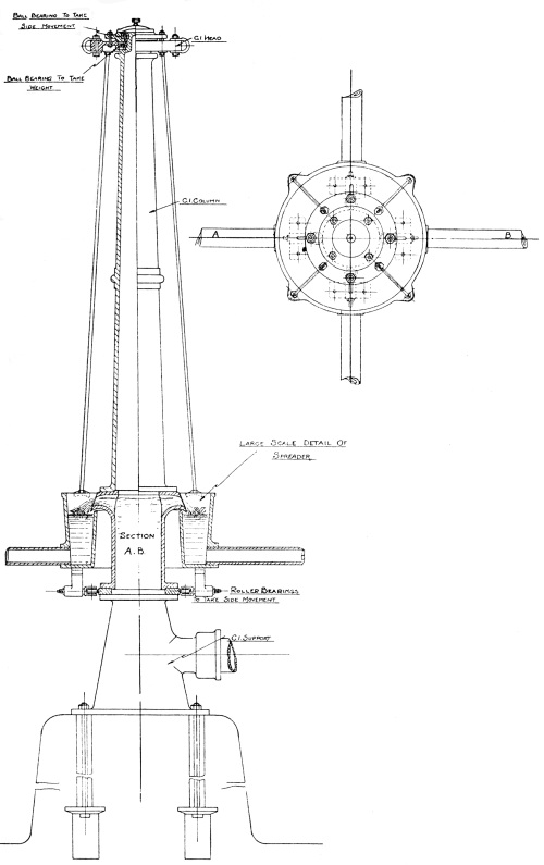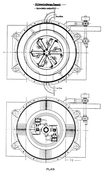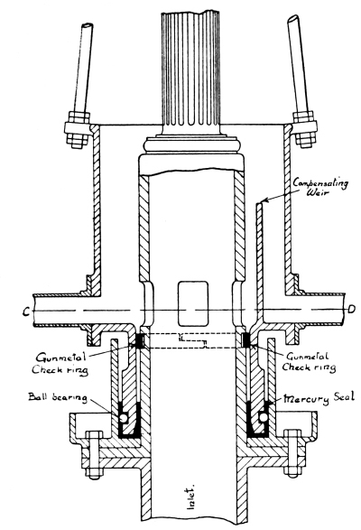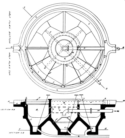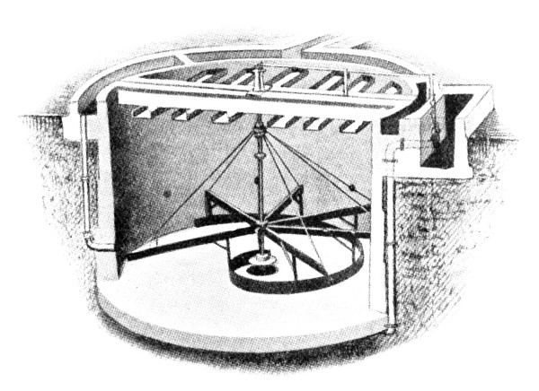 Special Apparatus for Sludge Removal.—A further type of detritus tank is illustrated in Fig. 15, in which the tank is circular in form but has a flat bottom. The sludge is discharged by the same means as that shown in Fig. 14, but a special scraping machine operated by hand is used to facilitate the removal of the sludge by drawing it towards the inlet to the sludge pipe, which is situated at the centre of the floor. The scraper, which is manufactured by Messrs. Ham, Baker and Co., is helical in form, and is attached to and rigidly supported by a framework mounted on the central shaft, which is rotated by suitable gearing fixed at the side of the tank over the sludge discharge inspection chamber, so that the operator may be able to regulate the rate of the sludge delivery. It will be noticed that the outlet from this tank is by means of cross-channels, described in detail later in connection with sedimentation tanks.