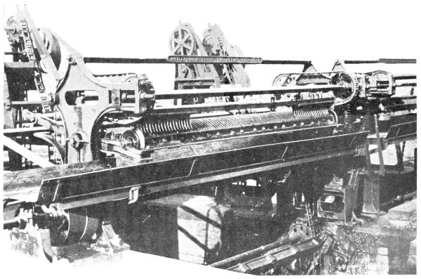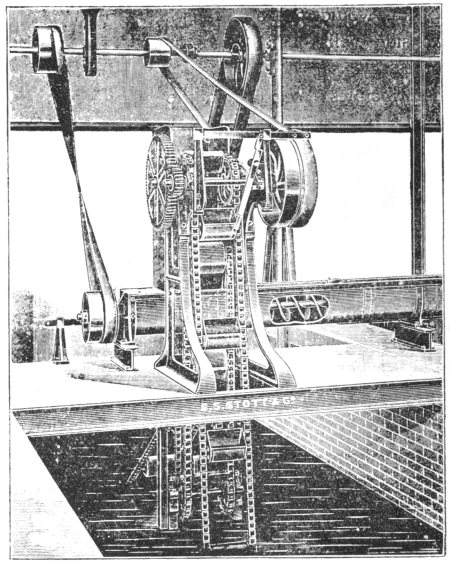 In the case of the screen, manufactured by Messrs. Whitehead and Poole, illustrated in Fig. 8, the bars are of tapered steel, and are so arranged that they can be removed and replaced if necessary. The special friction drive with which this machine is fitted, prevents the breaking of the chain should the rake prongs become caught in the screen. The rake-cleaning gear consists of two swing levers, which carry a cleaning comb and a balance weight to hold it in position over the dirt tray. As the rakes bring up the screenings and reach the delivery position, they pass through the cleaning comb, which is, at the same time, forced down by a catch on the chain engaging with flanged rollers on the end of the swing levers. In this way the rakes are effectively cleaned, and it is impossible for the rake prongs and the comb to foul each other.