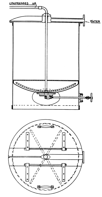 Dortmund Type of Tank.—Where the volume of sewage is fairly large, and it would be convenient to have the sludge outlet at 2 feet to 3 feet below the level of the invert of the outfall sewer, the advantages of designing the detritus tanks on the lines of the Dortmund tank may be considered. An example of this kind of tank is shown in Fig. 14. Tanks of this type have the following special features:—Great depth—from 16 feet to 20 feet below water level—and the bottom in the form of an inverted cone, with an outlet at its apex connected to a cast-iron sludge delivery-pipe, which may be carried up either outside the tank, as shown in solid lines, or on the inside of the tank, as shown in dotted lines. In either case this pipe should be continued 26 vertically up to, and finish with, an open end at the level of the top of the wall of the tank, so as to form a means for inspection and 27 rodding in case the pipe should become choked. From this vertical pipe a right-angled branch is arranged at about 2 feet below the top-water level in the tank, and provided with a sluice-valve. Ordinarily this valve is closed. When it is desired to remove the sludge deposited in the cone-shaped bottom of the tank, the sluice-valve on the sludge outlet is opened and the sludge is forced up by the head of water, due to the difference in level between the top-water level in the tank and the invert of the sludge-outlet. It has been stated that this method of sludge removal is subject to difficulties, due to the consolidation of the sludge in the cone, to such an extent that it becomes of too thick a consistence to flow up the vertical pipe. In some cases a special mechanical contrivance is adopted, by means of which the sludge may be stirred up at the apex of the cone-shaped bottom while the sludge-valve is open. Again, in a special form of tank which has been brought into 28 use in Germany, the sludge is stirred up by means of jets of water, under pressure from the main, forced through a ring-shaped perforated pipe laid near the apex of the cone. In both cases it is evidently assumed that the sludge will only be removed at long intervals, and in the author’s opinion the difficulties referred to above may be avoided by the application of the motto “Little and often,” as described in his book on the management of Sewage Disposal Works.