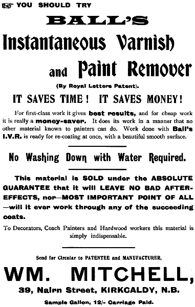 The colour having been determined, oil, turpentine, and driers are then added. The object of the driers is that of causing the paint material to dry quickly. There are several kinds of driers on the market, but the two best known are termed “patent driers,” which is sold in solid form, and the “liquid driers” or “japanners.” Whichever is used the actual quantity employed will depend very largely upon the pigment. Some pigments, say for instance, red lead may be considered in itself a drier, and the addition of any other is unnecessary. Others, like Vandyke brown, dry slowly, and much more driers will be necessary than is the case with white lead. Further on we give some idea of the proportions of materials to be used, but it will be understood that no exact information on the subject will be possible, for reasons that will be explained. It is of the utmost importance to remember that an excess of driers is most objectionable. It[9] often retards instead of increasing the drying quality, it causes cracks and blisters, and above all, it proves very destructive to the paint itself.