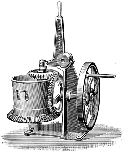 There are on the market two sorts of mixing machine for paints that would prove of great service to the painter who has to produce large quantities of paint. But, as a rule, they are only used by paint manufacturers. One known as the vertical mixer, is represented in Fig. 1, and is suitable for painters’ use. It consists of a cylinder which contains the paint, and in this are three bent knives or scissors. The handle attached, on being operated, turns the cylinder in one direction and the knives in the opposite direction, these knives in the meantime revolving around on their own axes. The paint is[10] thus mixed very quickly, and as the cylinder may be had to hold several gallons, in the case of bridge work, wall work, or other positions where a very large quantity of the same paint is required, the purchase, for a few pounds, of such a machine may mean a saving of a considerable amount of labour. The mixer illustrated is manufactured by Messrs. Torrance & Sons, of Bittern, Glos. In many shops, where large quantities of stone colour and other paints have to be turned out, such a machine would soon repay its cost.
