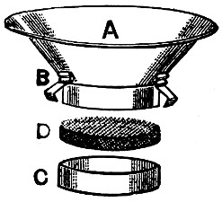 An excellent shape of paint strainer is that shown in Fig. 2, which is shown in parts in Fig. 3. A, represents the body of the strainer, B, the clips which hold the compression band C, and D, represents the gauze. The advantage of this construction is that the gauze after use may be easily taken out, cleaned and replaced. This strainer or its equivalent should form part of the equipment of every paint shop, large or small.