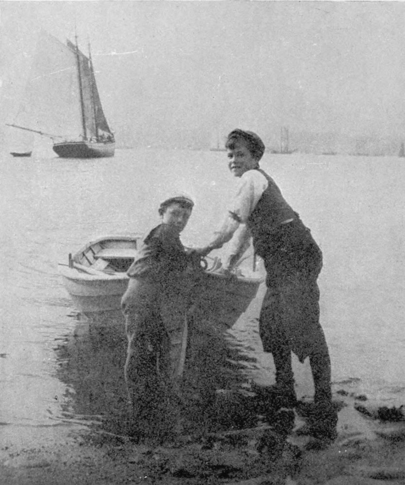 The men who tar the boat to-day may have turned their hands to something else by to-morrow. On fine days the old sails are spread out on the beach to dry or stood to flap-in-the-breeze from the mast-hole of some old boat on the beach, long ago condemned as unseaworthy and gradually being disintegrated by the elements. Oh what lovely seats these old gunwales make for the audience of men and boys, eyes aflame with imagination, as some old grandfather of the beach, in the role of raconteur, makes the details of a noted gale live anew in the vision of his listeners. To-morrow these listeners of to-day may themselves be tossing in the arms of a gale and half-drowned in the volume of green water encompassed by the “crest” and the “trough”.