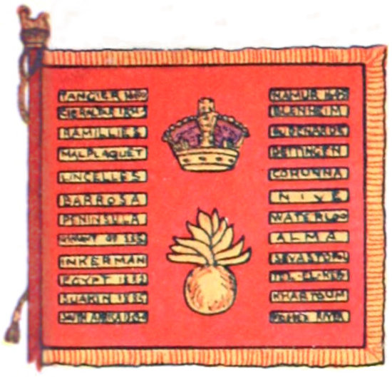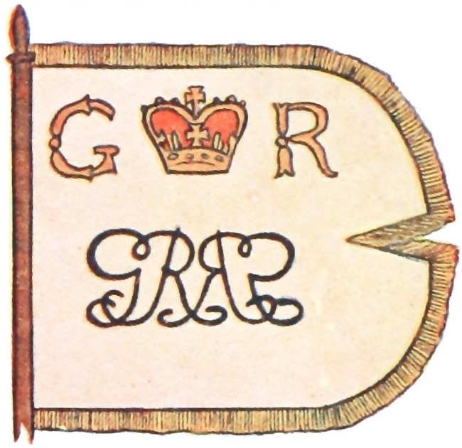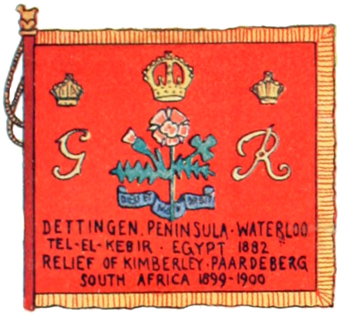 “The King’s Own Troop of Horse Guards and Troop of Grenadiers.—The standard, crimson with the royal cypher and crown; the guidon, differenced only from the standard by being rounded and slit at the ends.