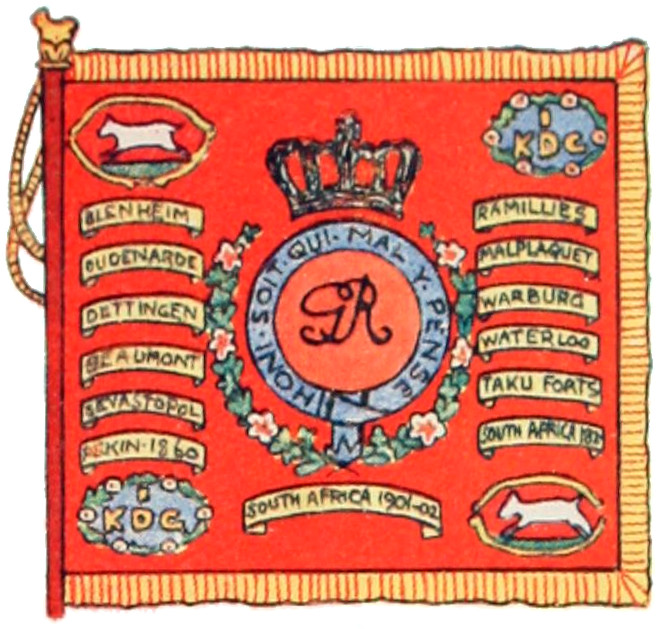 “The King’s Own Royal Regiment of Dragoons, commanded by John, Lord Churchill.—The colours to each troop thus distinguished: the colonel’s, the royal cypher and crown embroidered upon crimson; the lieutenant-colonel’s, the rays of the sun, proper, crowned, issuing out of a cloud, proper, and is a badge of the Black Prince’s. The first troop has, for colours, the top of a beacon, crowned or, with flames of fire proper, and is a badge of Henry V. The second troop, two ostrich’s feathers crowned argent, a badge of Henry VI. The third, a rose and pomegranate impaled, leaves and stalk vert, a badge of Henry VIII. Fourth troop, a phœnix in flames, proper, a badge of Queen Elizabeth; each embroidered upon crimson.