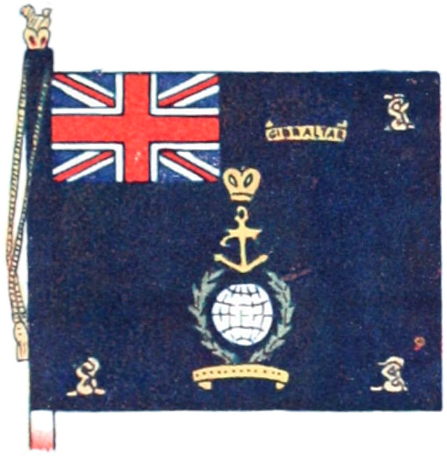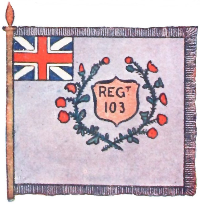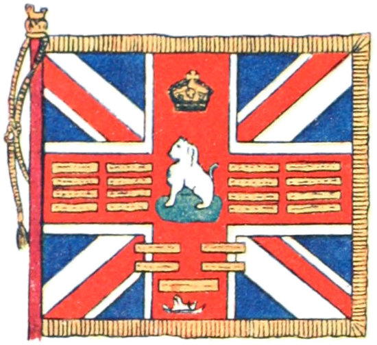“The Queen’s Regiment of Foot, commanded by the Hon. Piercy Kirk, flyes a red cross bordered with white and rays as the admirals (see below), in a green field, with Her Majesty’s royal cypher in the centre.